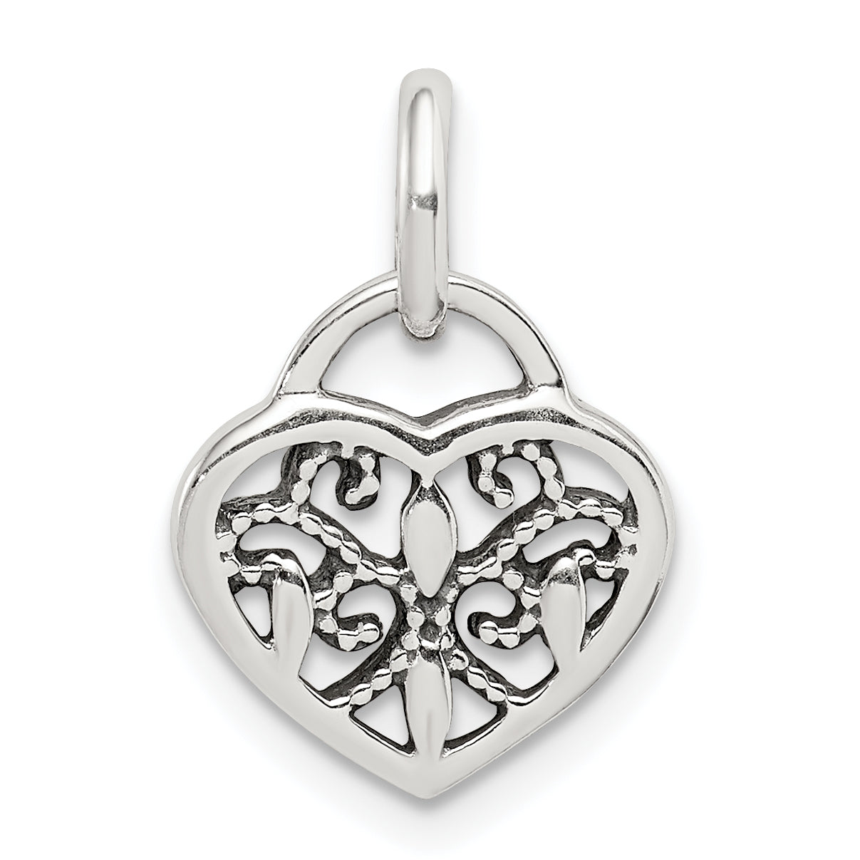 The Sterling Silver Antique Heart Charm captivates with its elegant design. Crafted from pure 925 sterling silver, this charm boasts an antiqued finish, giving it an alluring, vintage vibe. Measuring 13.26 mm in length and 12.31 mm in width, it fits perfectly as a pendant or charm. The heart charm itself is a delightful 12.5 mm by 11.7 mm, adding subtle charm to any jewelry piece. The bail measures 1.25 mm in width and 6.68 mm in length, ensuring easy attachment. Add a touch of class to your collection with this Sterling Silver Antique Heart Charm.