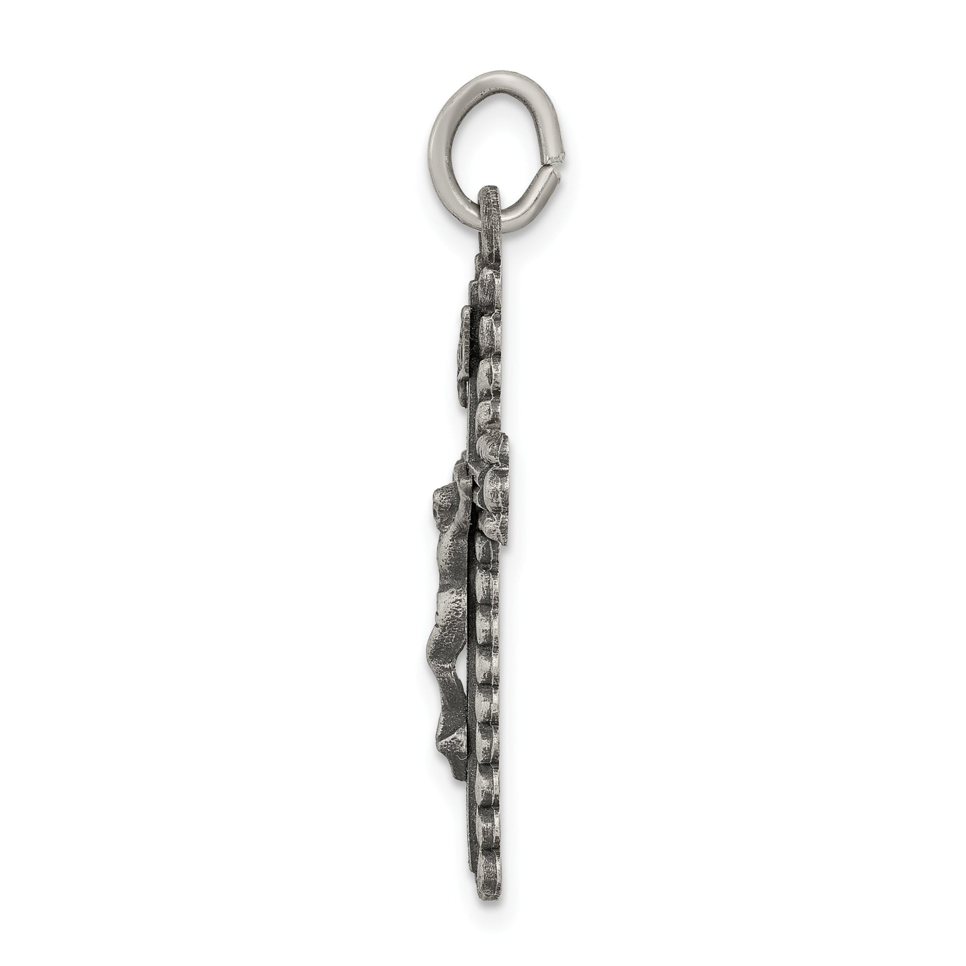 Introducing the Sterling Silver Antiqued and Brushed INRI Crucifix Pendant—a timeless piece of elegance and faith. Made from 925 sterling silver, this pendant showcases a polished finish that brings a gentle shine to its antique charm. Its dimensions—33 mm in length, 18.53 mm in width, and 3.15 mm in thickness—offer a solid and compact design that is both stylish and enduring. Expertly crafted through a die-struck process, this flat-back themed pendant is ideal for those seeking a refined touch of religious symbolism. Wear the Sterling Silver Antiqued and Brushed INRI Crucifix Pendant to carry a piece of serenity and grace.