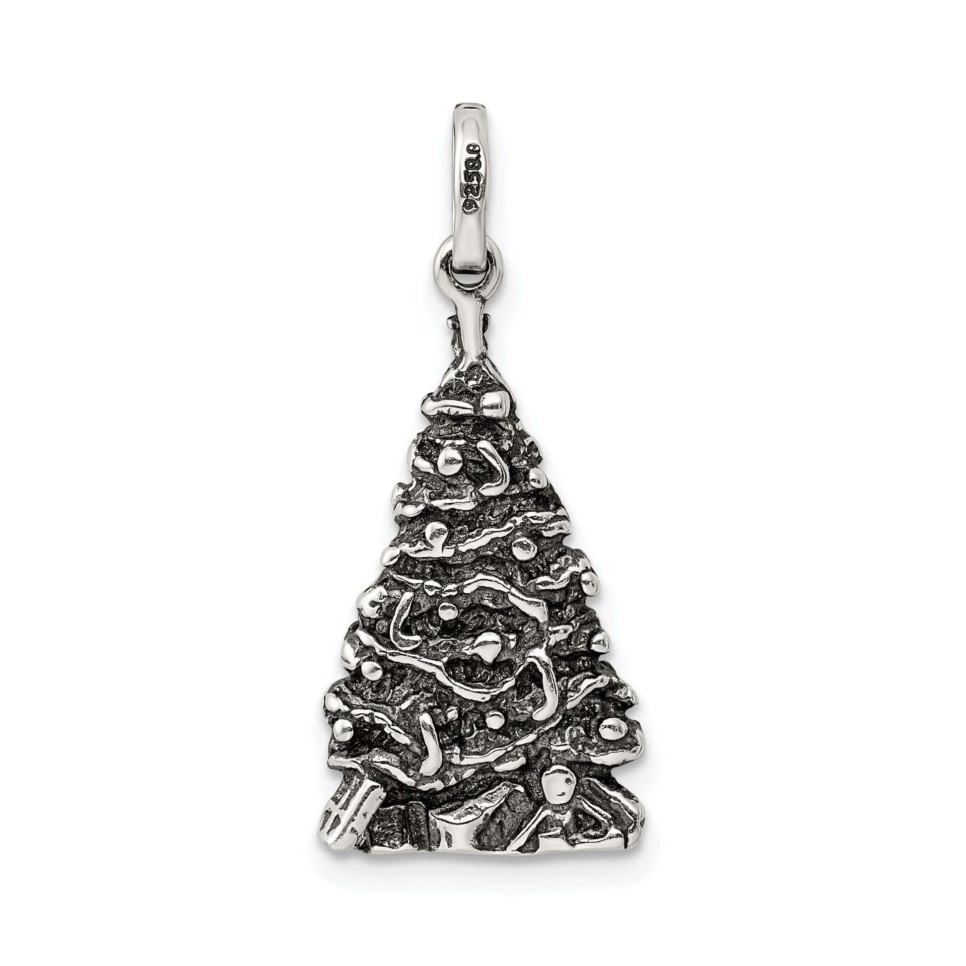 The Sterling Silver Antiqued Christmas Tree Charm dazzles with holiday cheer. Crafted from high-quality 925 sterling silver, this themed charm boasts a solid, durable design. Measuring 31 mm in length and 14 mm in width, it makes a lovely addition to any pendant or charm collection. The charm itself is 21.53 mm long and 12.8 mm wide, making it an exquisite piece with an antiqued finish for nostalgic appeal. This beautiful piece showcases a classic look perfect for celebrating the festive season. Enhance your jewelry ensemble with the Sterling Silver Antiqued Christmas Tree Charm.