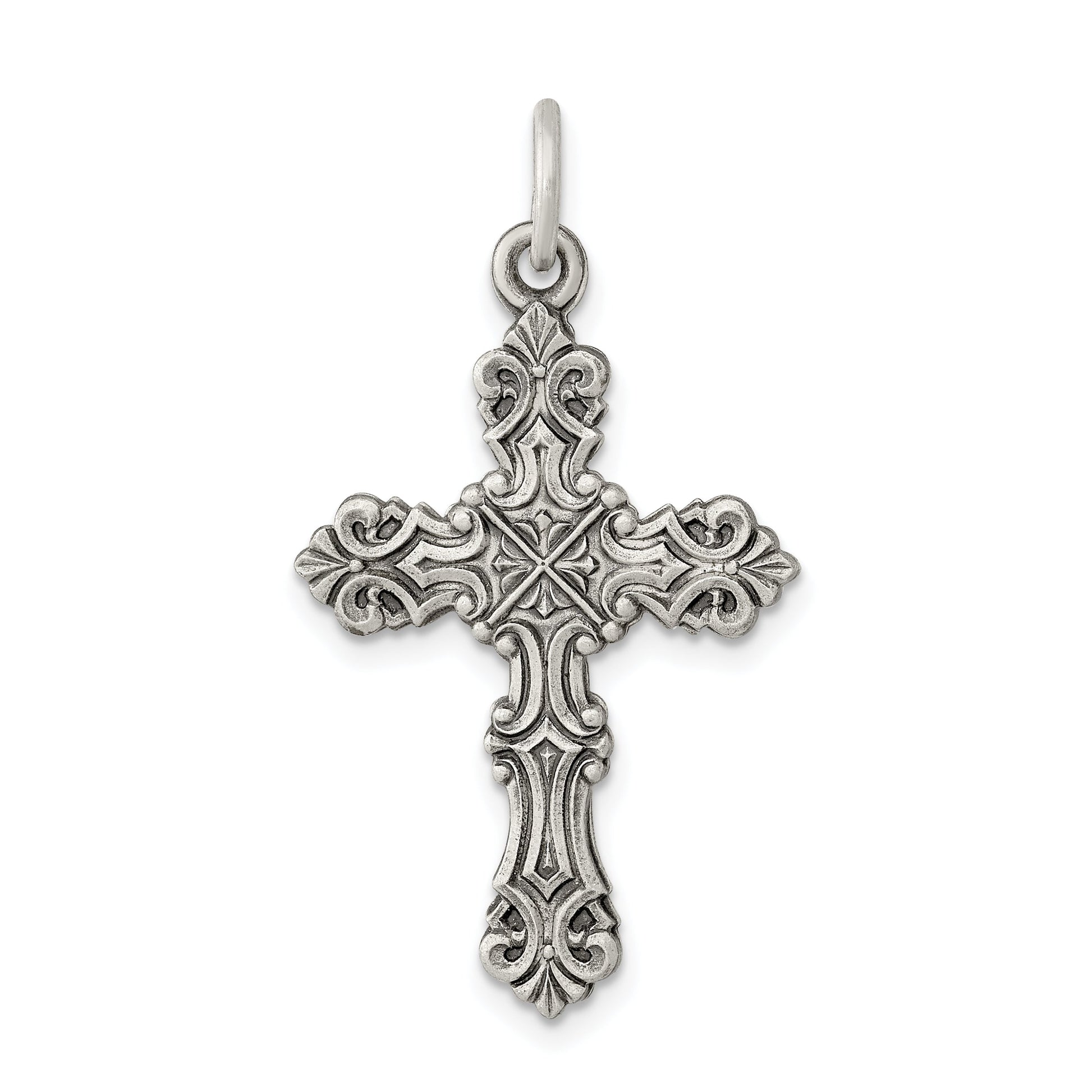The Sterling Silver Antiqued Cross Pendant offers a blend of tradition and elegance. Impressively crafted from 925 pure sterling silver, this piece reflects quality, with a polished finish that glimmers in the light. The pendant measures 31 mm in length and 20 mm in width, with the charm itself spanning 27.25 mm by 19 mm, making it a subtle yet striking accessory. Its die-struck construction ensures durability, while the solid design adds a classic touch. Whether worn alone or layered, the Sterling Silver Antiqued Cross Pendant is a timeless piece that enriches any jewelry collection.