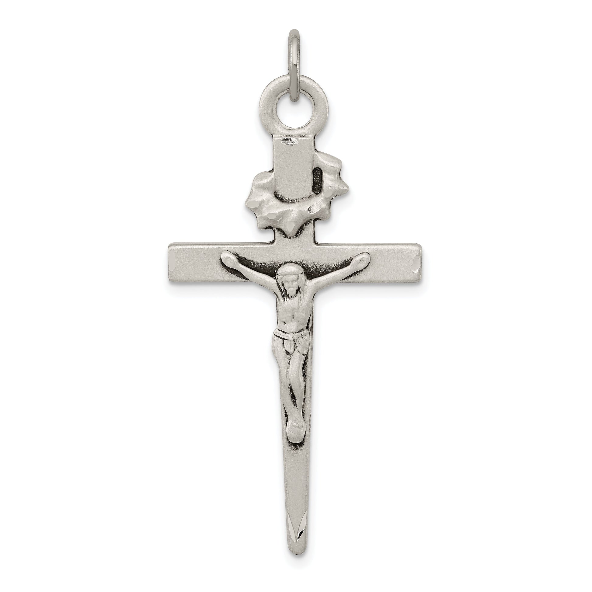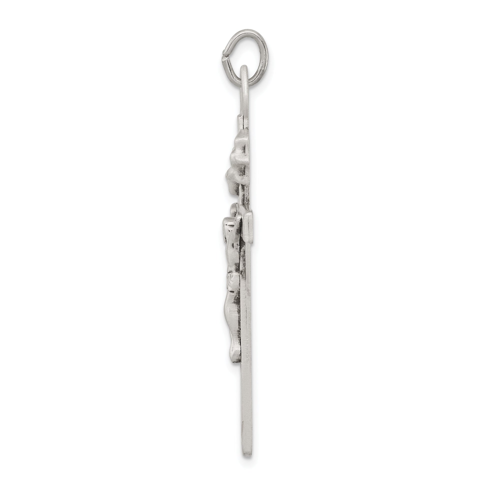 Introducing the Sterling Silver Antiqued Crucifix Pendant, a timeless piece crafted from 925 sterling silver. This heirloom-quality pendant shines with a polished finish and features intricate detailing with a solid design. It measures 47 mm in length, while the crucifix itself stands at 38 mm tall, with a width of 23.25 mm. The flat-back profile adds comfort when worn. Created through the die-struck manufacturing process, this is a durable and lasting piece. The Sterling Silver Antiqued Crucifix Pendant captures the essence of elegance and faith, making it a must-have addition to your jewelry collection.