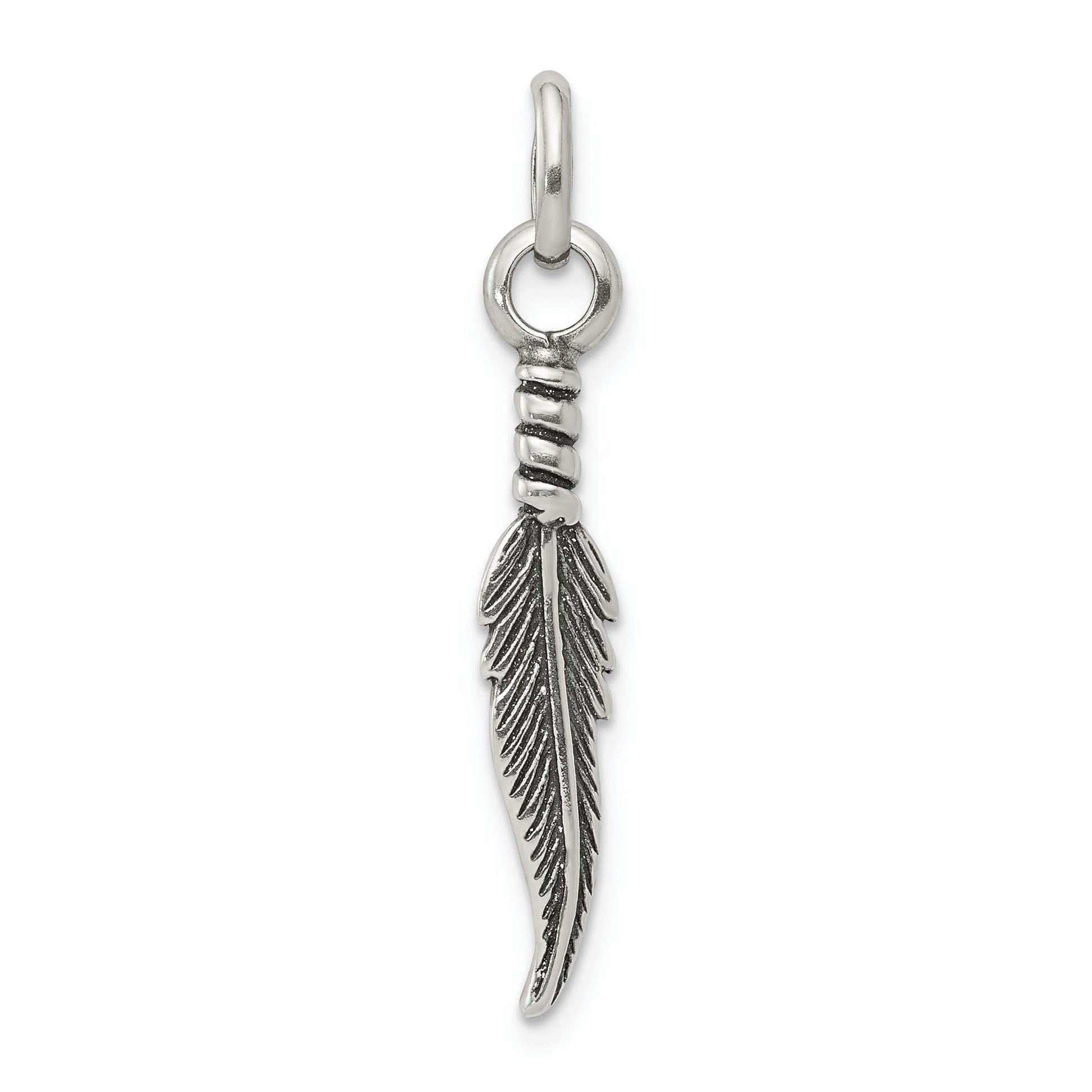 The Sterling Silver Antiqued Feather Charm adds a touch of rustic elegance to your jewelry collection. Made from genuine 925 sterling silver, this charm showcases a detailed feather design with an antiqued finish that enhances its timeless appeal. At 30 mm long, with the actual charm measuring 23 mm in length and 5 mm in width, it offers a solid yet delicate presence. Expertly cast, the charm embodies enduring craftsmanship, perfect for men's pendants or themed collections. The Sterling Silver Antiqued Feather Charm is a sophisticated addition to any attire.