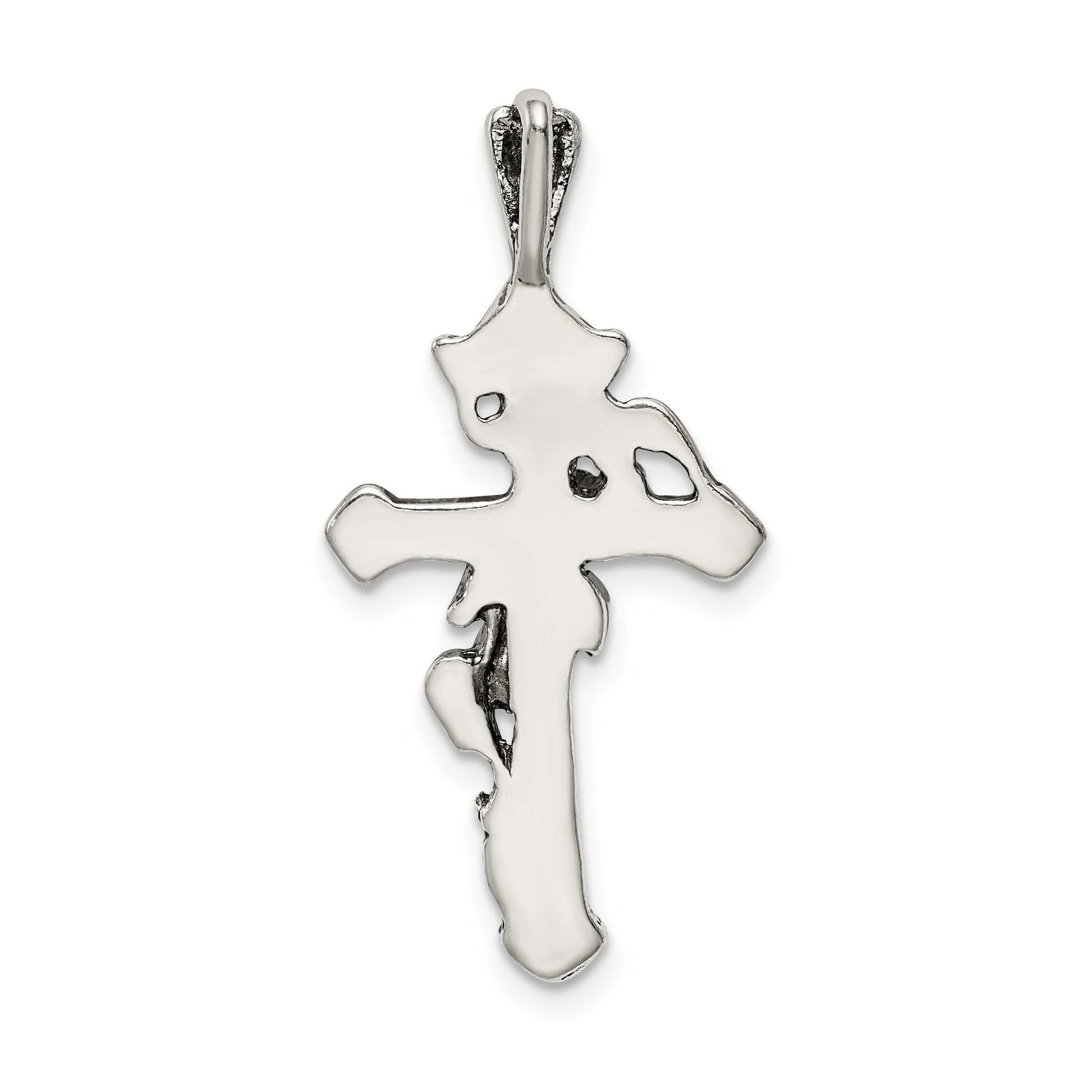 The Sterling Silver Antiqued Flowered Cross Pendant is a beautiful piece of jewelry that adds elegance to any outfit. Crafted from solid 925 sterling silver, it has a polished finish that enhances its charm. The pendant measures 34 mm in length with a detailed charm length of 26.73 mm and a width of 15.75 mm. The antiqued flower design gives it a classic and timeless appeal. Ideal for everyday wear or special occasions, the Sterling Silver Antiqued Flowered Cross Pendant is a versatile addition to any jewelry collection.