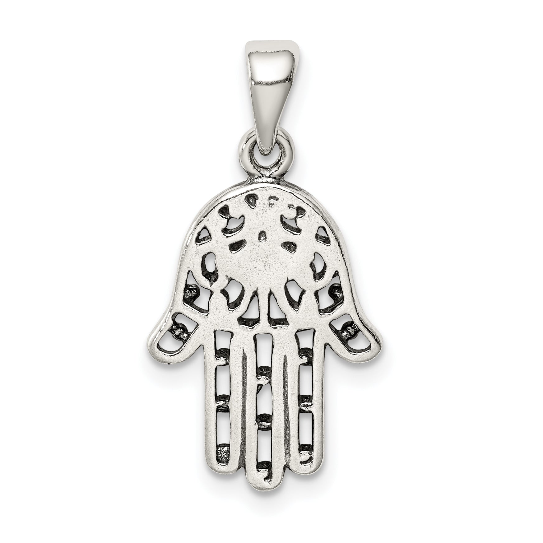 The Sterling Silver Antiqued Hamsa Pendant perfectly captures timeless elegance. Crafted from exquisite 925 sterling silver, the pendant's antiqued finish sets it apart, offering a vintage yet refined appearance. Rhodium plating enhances its luster, ensuring this piece retains its brilliance over time. Featuring a solid construction, the pendant measures a neat 25.02 mm in length and 12.86 mm in width, with a themed charm element delicately detailed. The versatile silver tone suits both casual and formal styles, making it a jewel that complements various looks. Discover the charm of the Sterling Silver Antiqued Hamsa Pendant, a true emblem of sophistication.