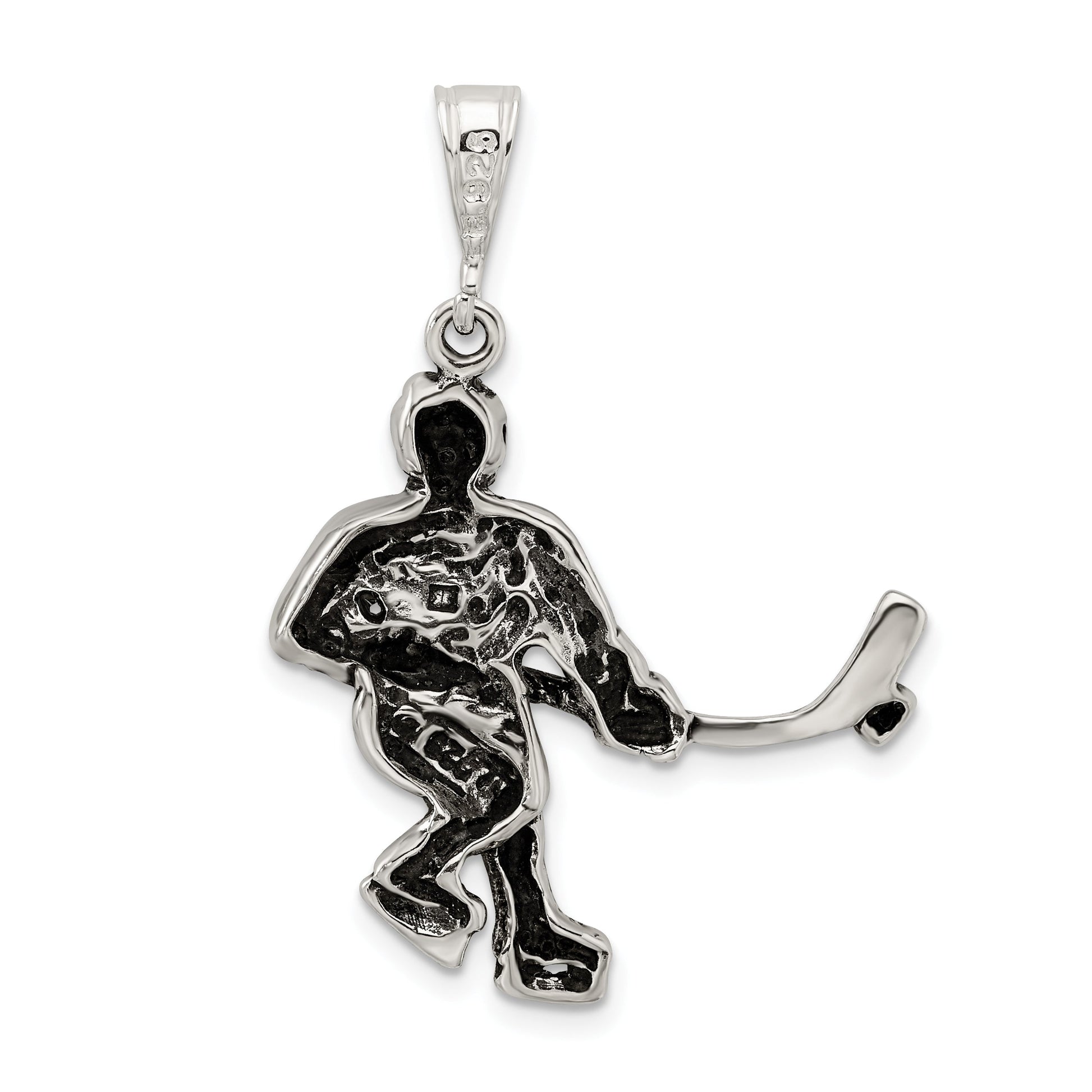 The Sterling Silver Antiqued Hockey Player Charm is a striking piece of jewelry that captures the spirit of the game. Expertly crafted from polished 925 sterling silver, this charm boasts an impressive solidity and intricate craftsmanship. Measuring 37 mm in length, with a 31 mm charm length and 28 mm width, it offers significant presence. Perfect for men's jewelry collections, its precision casting ensures durability and timeless appeal. The 6 mm bail allows easy attachment to any chain. Add this sterling silver antiqued hockey player charm to elevate your style with a dash of sporty elegance.