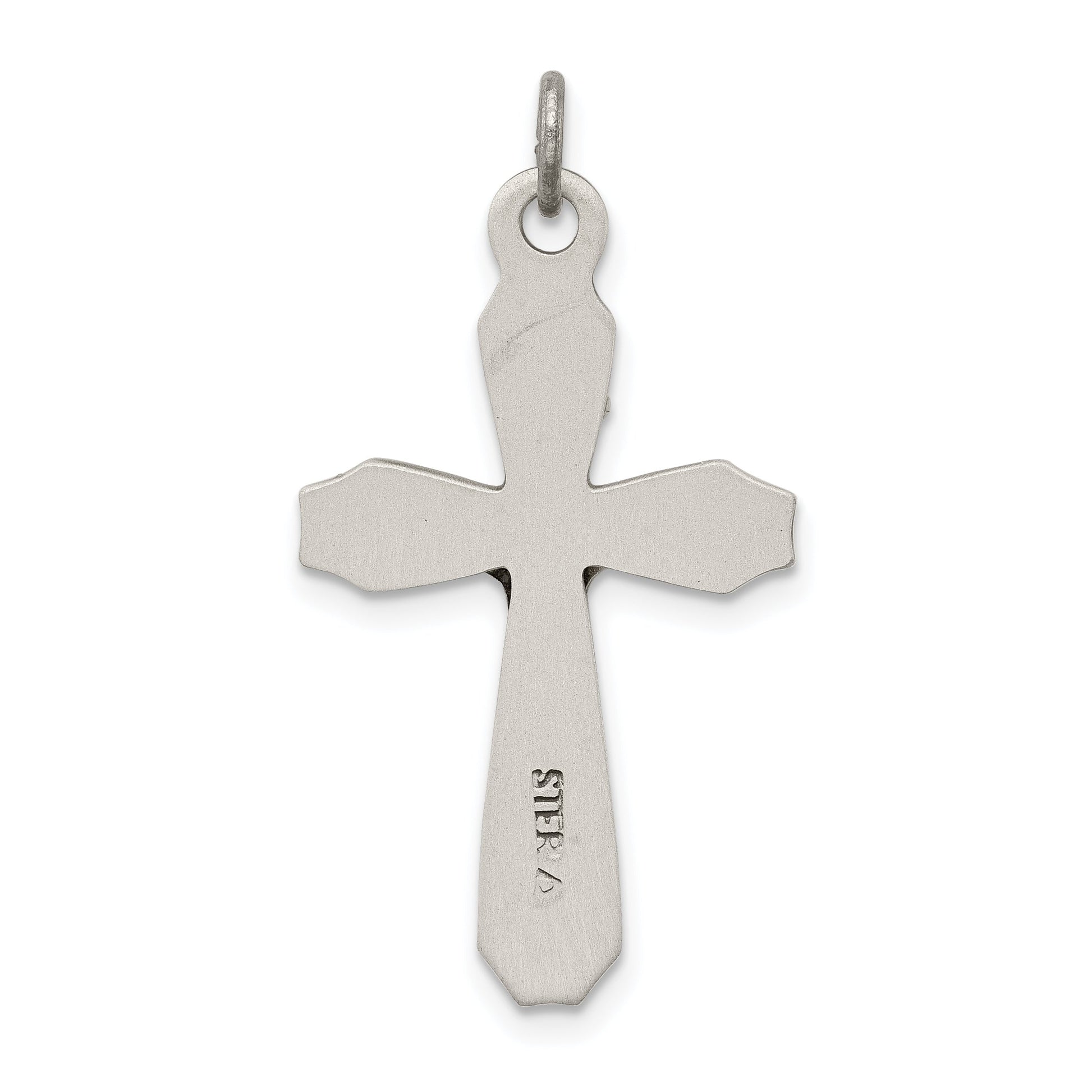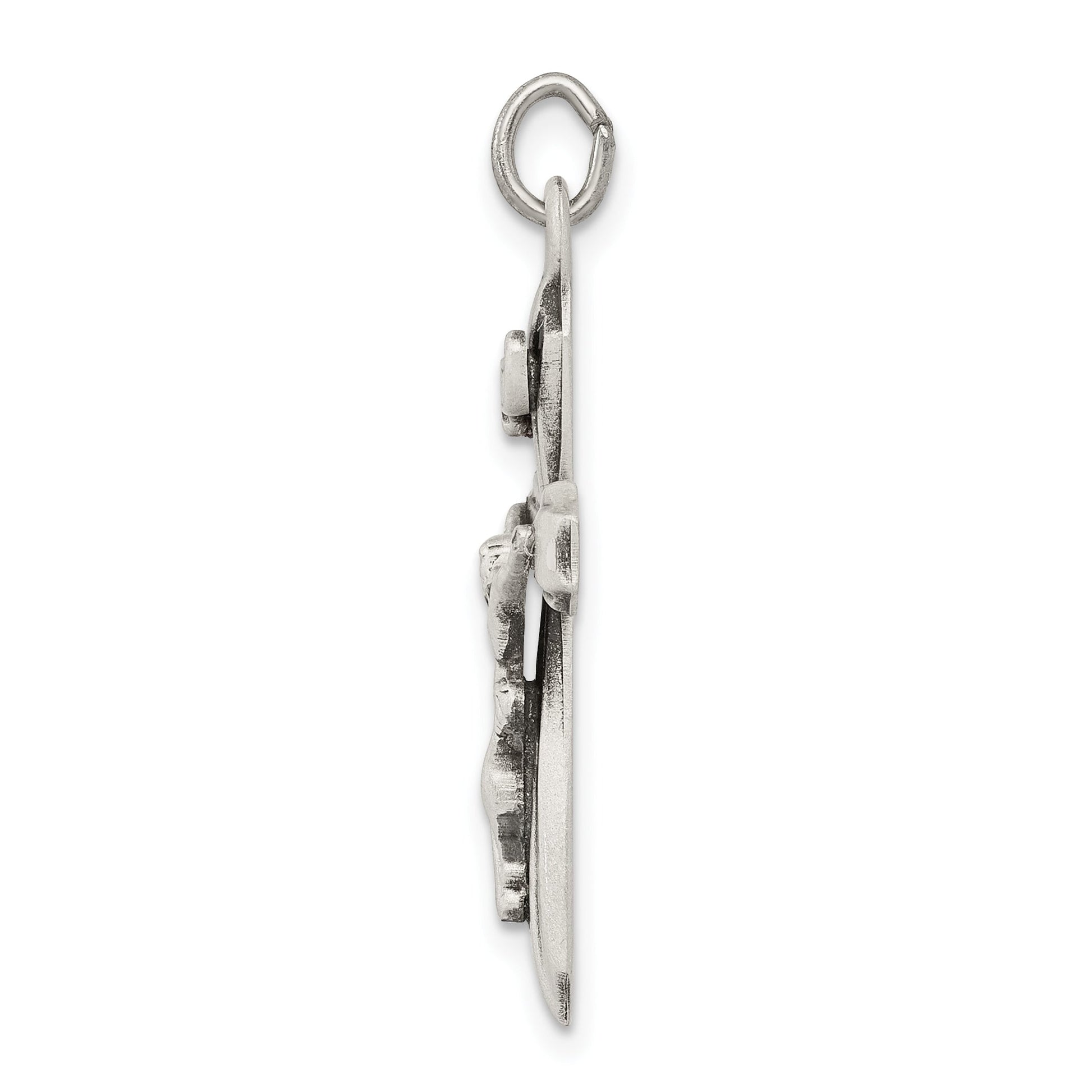 The Sterling Silver Antiqued INRI Crucifix Pendant is a remarkable piece of fine jewelry that combines faith and elegance. Crafted with 925 sterling silver, this pendant boasts a polished finish, offering a sleek and timeless look. Its dimensions measure 30 mm in length and 16 mm in width, making it a perfect size to wear comfortably. The pendant features a solid design, achieved through a die-struck manufacturing process, ensuring lasting durability. This themed pendant with a flat back profile serves as a meaningful adornment. The Sterling Silver Antiqued INRI Crucifix Pendant is a tasteful statement of spirituality and style.