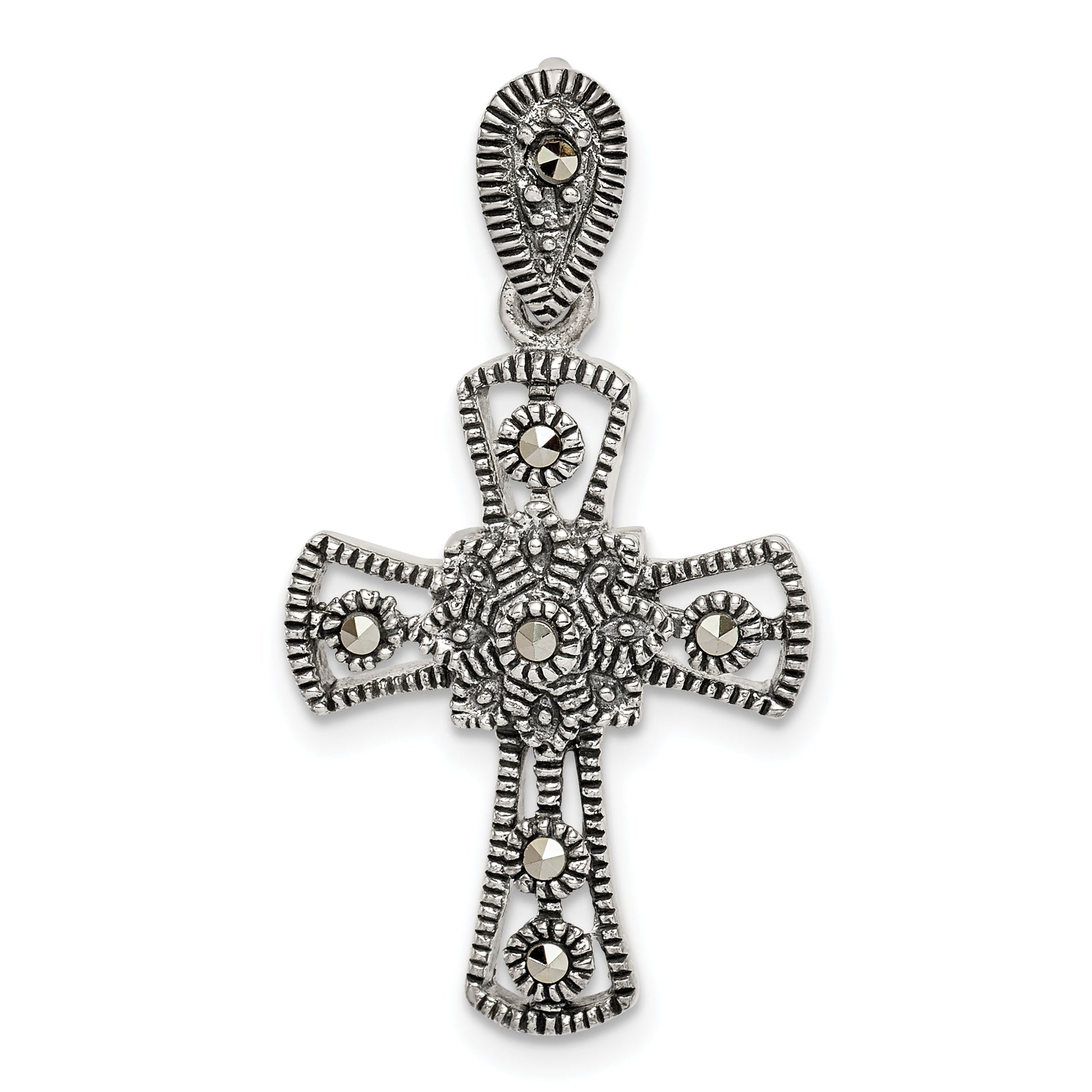 Adorn yourself with this Sterling Silver Antiqued Marcasite Flower Cross Pendant, an exquisite piece that adds a touch of elegance to any outfit. Crafted from sterling silver with a purity of 925, the pendant features a charming antique finish. Its flower cross design, accented with marcasite details, stands out beautifully against the gleaming silver. The charm measures 23.97 mm in length, with a width of 16.14 mm. The twin flower design makes this pendant an ideal choice for both daily wear and special occasions. Elevate your jewelry collection with this eye-catching Sterling Silver Antiqued Marcasite Flower Cross Pendant.