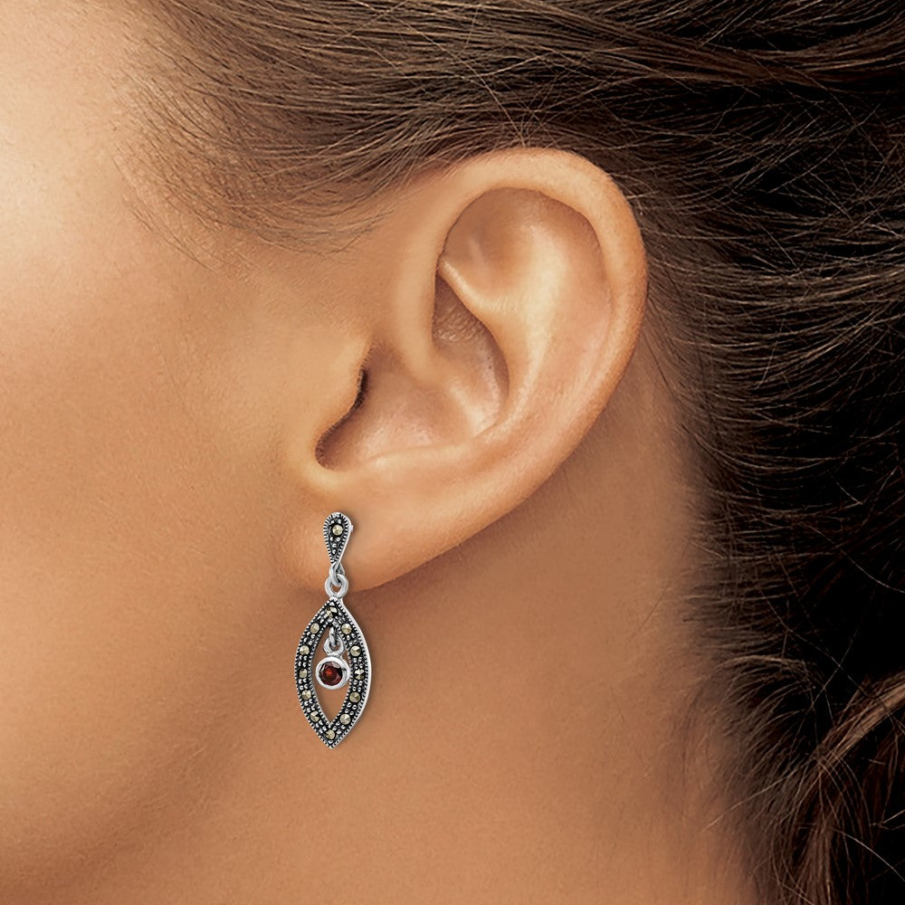 The Sterling Silver Antiqued Marcasite & Red Glass Stone Post Dangle Earrings will make any outfit shine. Made from 925 sterling silver, these earrings showcase red glass stones paired with marcasite, creating a dazzling sparkle. Each earring measures 28.6mm in length and has a width of 9.58mm, offering a perfect balance of boldness and elegance. The round stones are securely set on an open back with a textured finish. A post and push-back closure keeps them snug on your ears. Elevate your style with these striking Sterling Silver Antiqued Marcasite & Red Glass Stone Post Dangle Earrings.