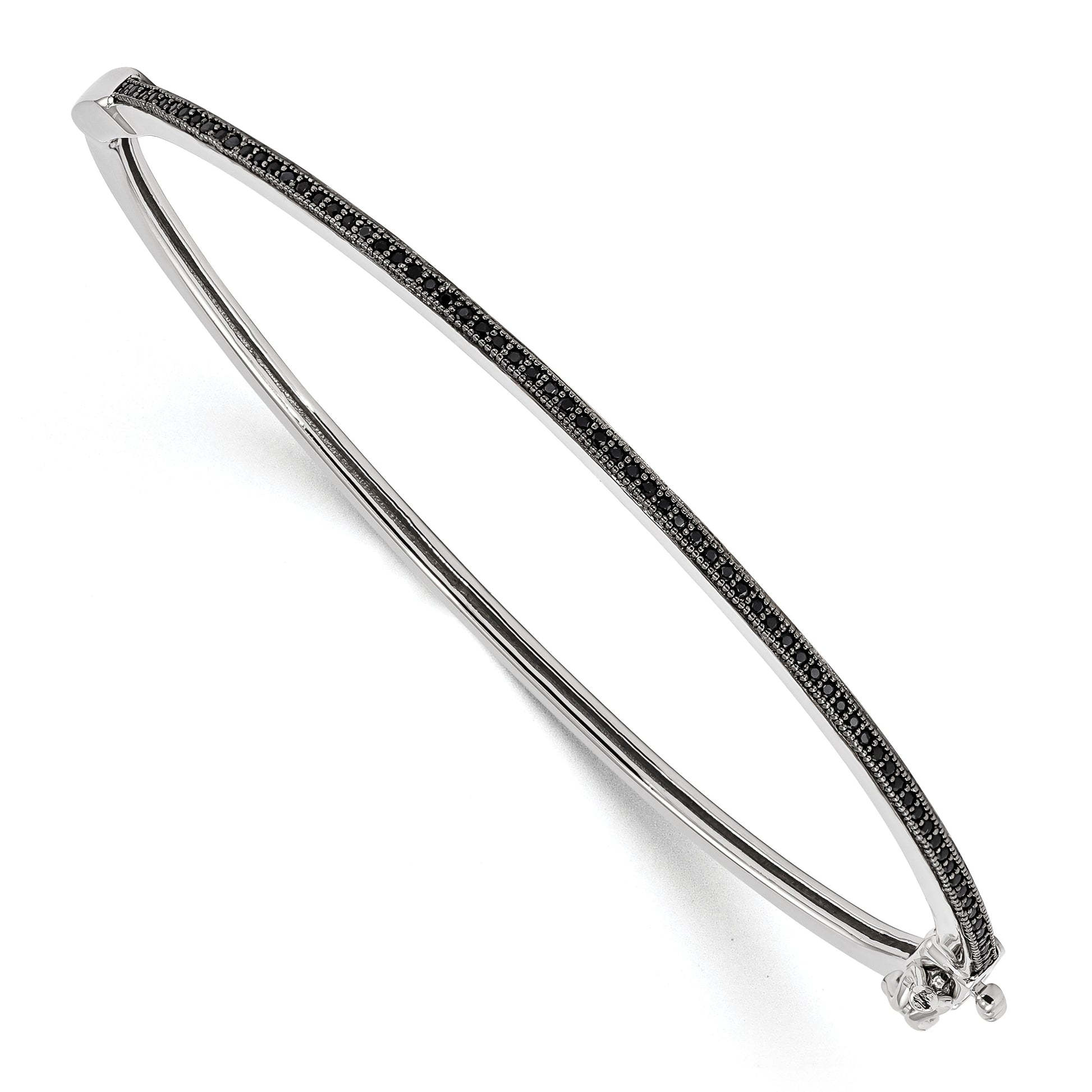 Introducing the Sterling Silver Brilliant Embers Rhodium-Plated 71 Stone Micro Pavé Black CZ Polished Hinged Bangle. This stunning bracelet combines elegance with modern charm, crafted from pure 925 sterling silver. The eye-catching black cubic zirconia stones sparkle with each movement, precisely set in a micro pavé design. A polished finish enhances its shine, while a hinged style ensures easy wearability and a secure fit. This striking bangle's sleek 2 mm width accentuates its timeless appeal. Elevate your jewelry collection with the Brilliant Embers bangle, where sophistication meets exquisite craftsmanship.