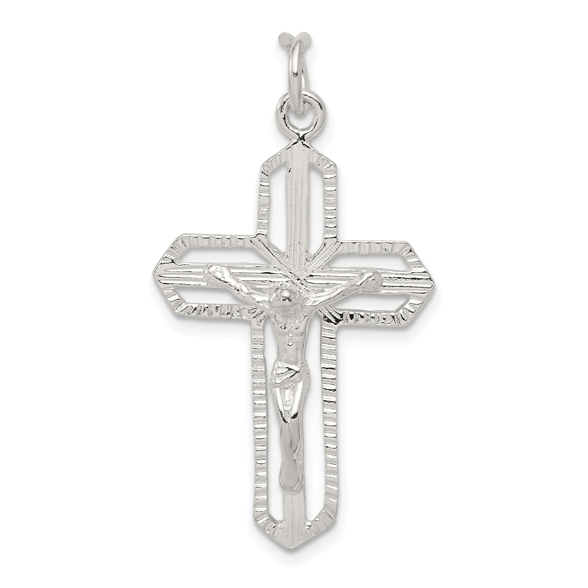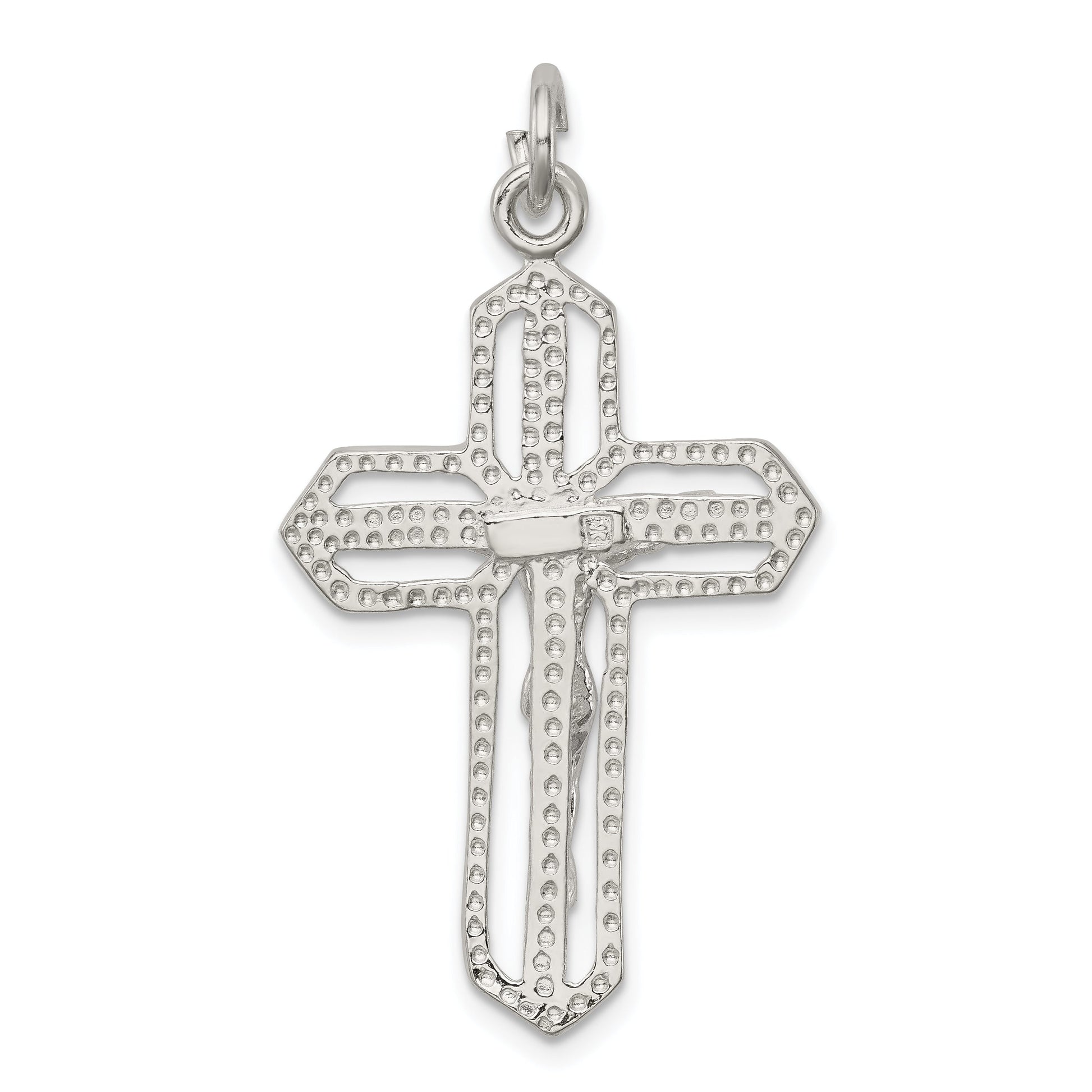 The Sterling Silver Crucifix Pendant captures timeless elegance in its polished 925 sterling silver design. This resplendent piece, measuring 37 mm in length, shines with its anti-tarnish finish, ensuring lasting brilliance. The crucifix charm itself, with dimensions of 30.4 mm by 20.5 mm, is cast with precision, offering a solid build that showcases an intricately textured back. Perfect for both daily wear and special occasions, this pendant embodies grace and spiritual significance. Add the Sterling Silver Crucifix Pendant to your collection for a truly meaningful expression of faith.