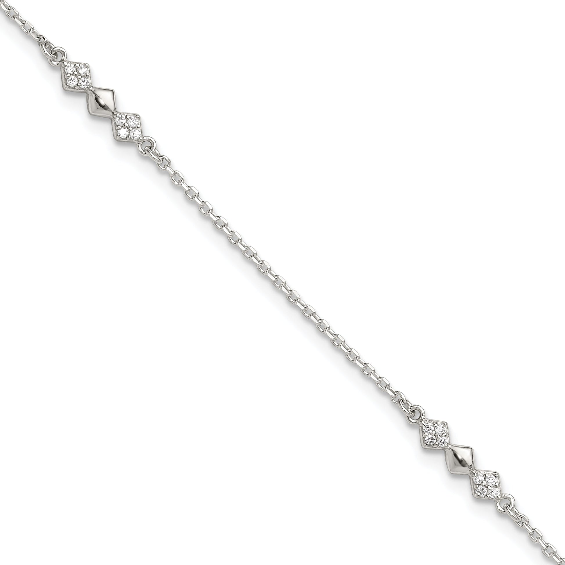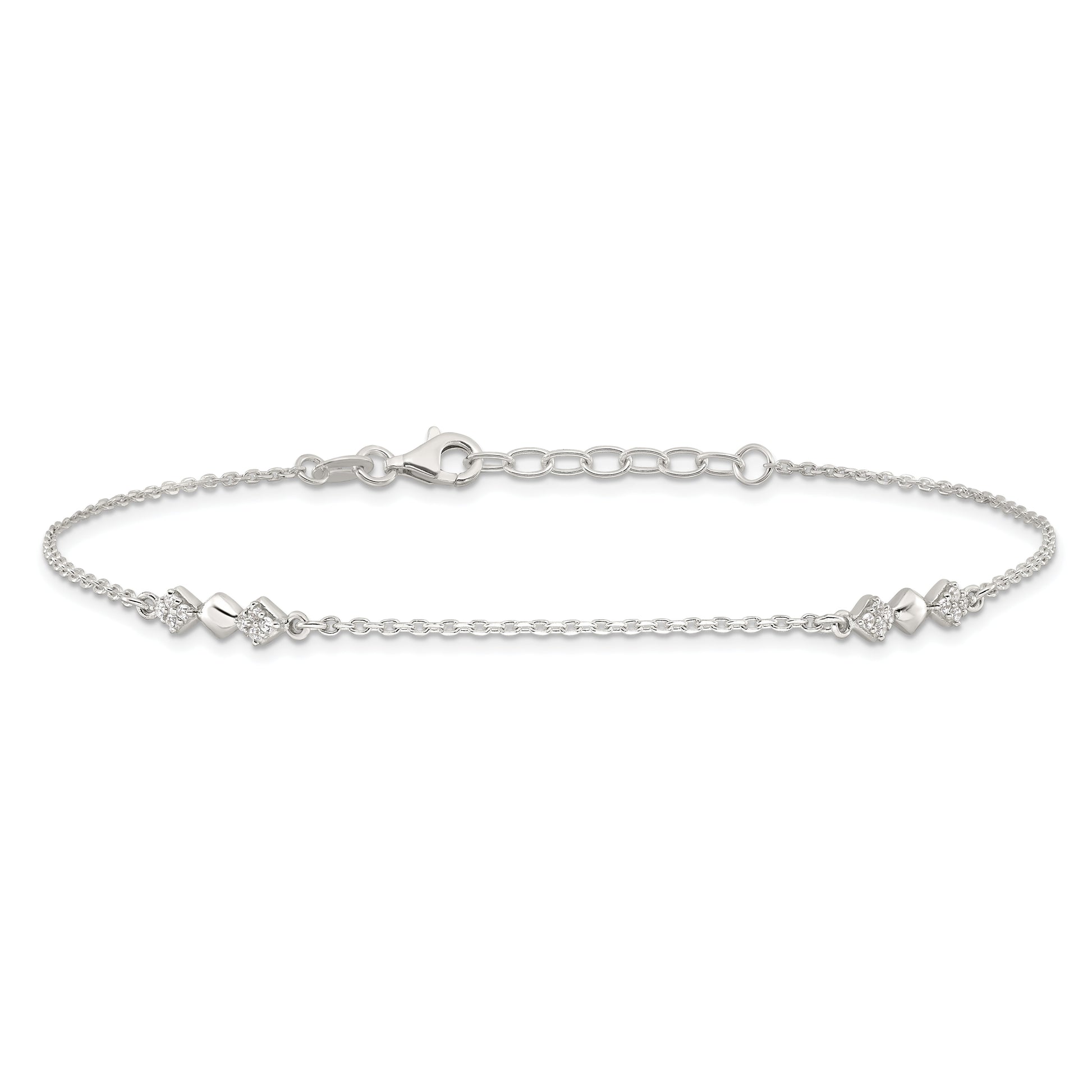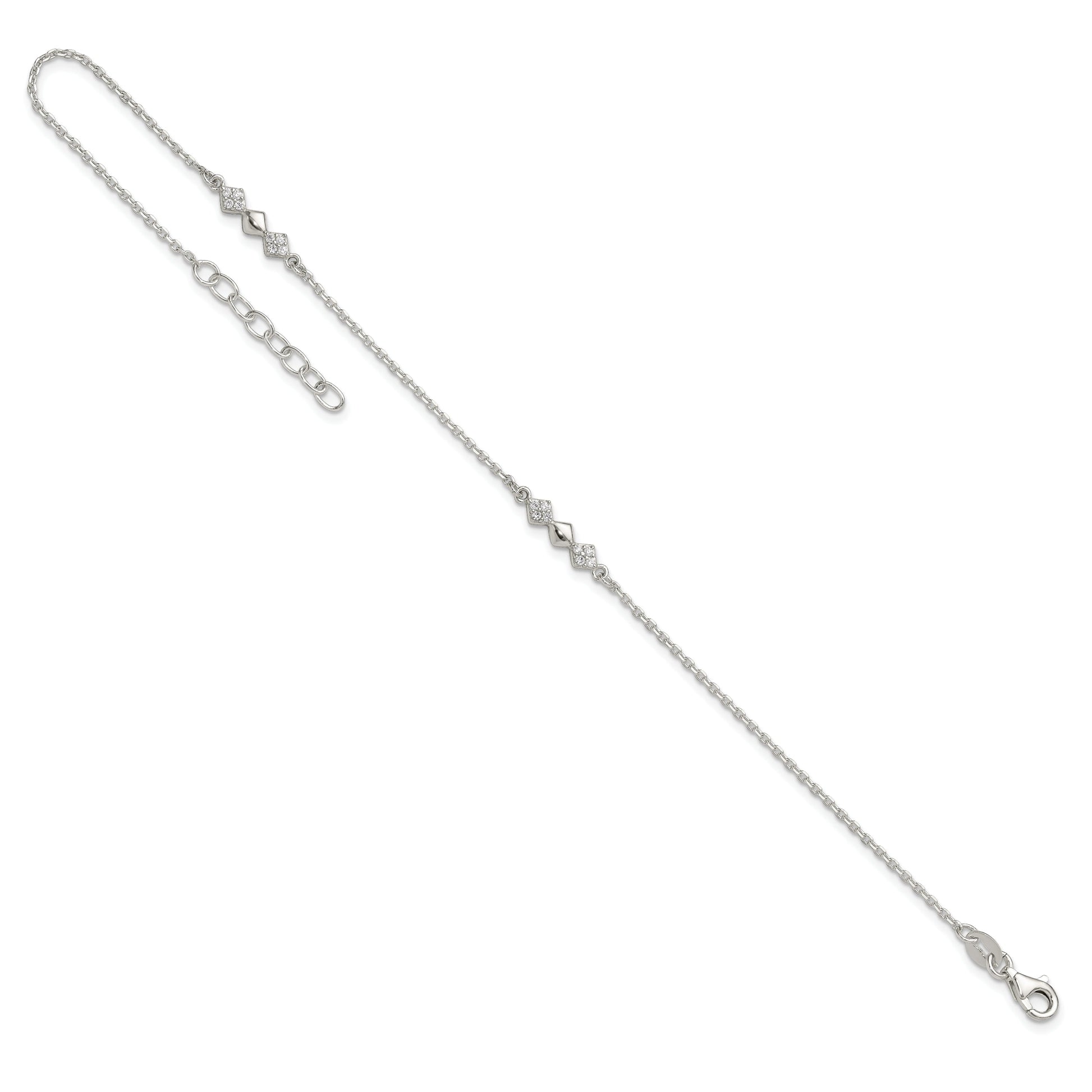 The Sterling Silver CZ 3-Diamond Shapes 9-Inch Plus 1-Inch Ext. Anklet is a sparkling addition to any jewelry collection. It's crafted from polished 925 sterling silver, offering a sleek and shiny finish. This anklet features three dazzling cubic zirconia stones, each boasting a bright white hue. The adjustable 9-inch cable chain, plus a 1-inch extender, ensures the perfect fit. A lobster clasp secures it comfortably around the ankle. With its elegant anti-tarnish coating, this women's anklet remains vibrant throughout the years. Embrace timeless elegance with the Sterling Silver CZ 3-Diamond Shapes Anklet and elevate your style effortlessly.