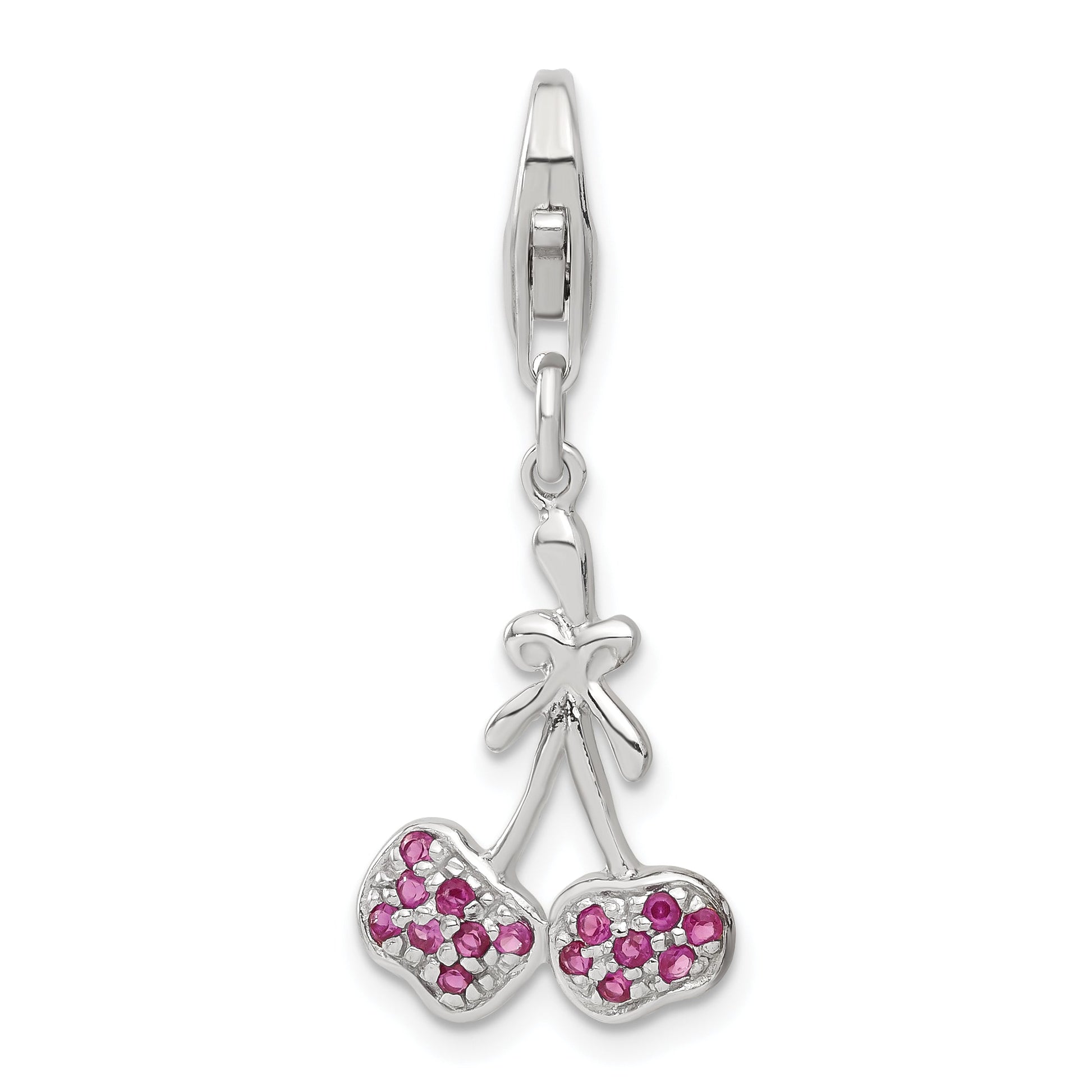 The Sterling Silver CZ Cherries Charm radiates elegance and whimsy, making it a must-have for charm collectors. Crafted from high-quality 925 sterling silver, this polished piece gleams with a shine that captures attention. The charm features sparkling synthetic cubic zirconia stones that mimic real cherries, adding a playful yet sophisticated touch. Measuring 32.5 mm in length and 13.2 mm in width, it's an ideal size for any necklace or bracelet. Add a pop of character to your jewelry collection with this themed piece. Enjoy the Sterling Silver CZ Cherries Charm today.