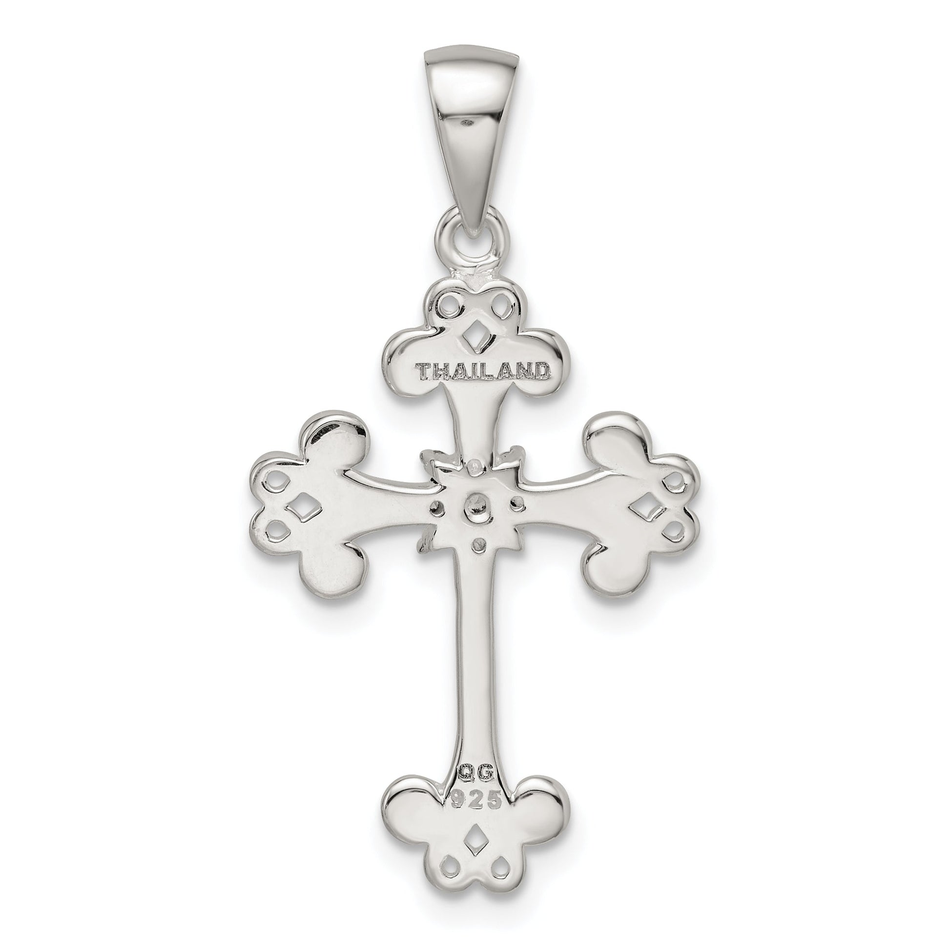 The Sterling Silver CZ Cross Pendant is a stunning piece of jewelry that's sure to turn heads. Crafted from 925 sterling silver, this pendant features nine round cubic zirconias that shimmer like real diamonds. Its sleek design is polished to perfection and treated with an anti-tarnish coating, ensuring it stays bright and beautiful. Measuring 33.33 mm in length, it's sized to make a statement without being overwhelming. The open-back profile adds depth and showcases the sparkling stones brilliantly. Perfect for any woman who loves a touch of elegance, the Sterling Silver CZ Cross Pendant makes every outfit shine.