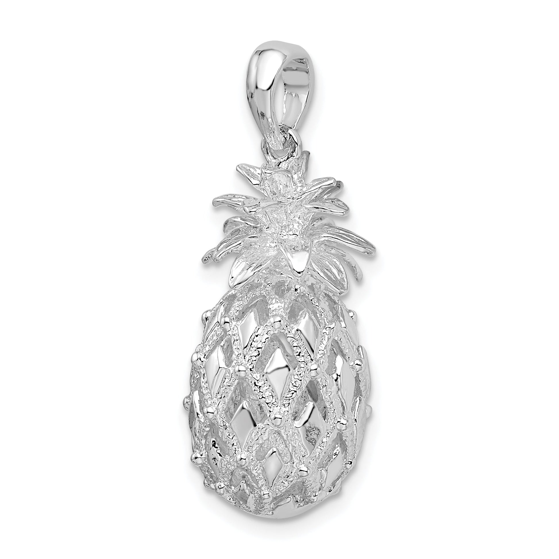 The Sterling Silver De-Ani Rhodium-Plated Polished 3D Cut-Out Large Pineapple Pendant makes a lively statement. Crafted from 925 sterling silver, its polished finish adds a sleek shine, with rhodium plating for extra durability. This pineapple-shaped pendant features a captivating 3D cut-out design. Measuring 33 mm in length and 13 mm in width, it offers an eye-catching charm. Its silver-tone plating complements the bright, white hue of sterling silver. Whether dressed up or worn on a casual day, the Sterling Silver De-Ani Pineapple Pendant is sure to delight.
