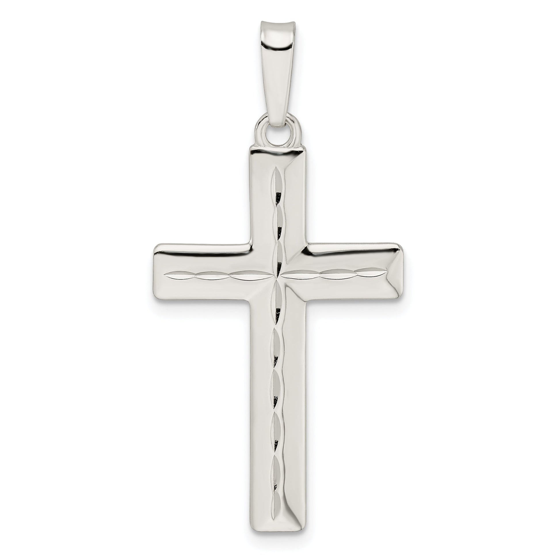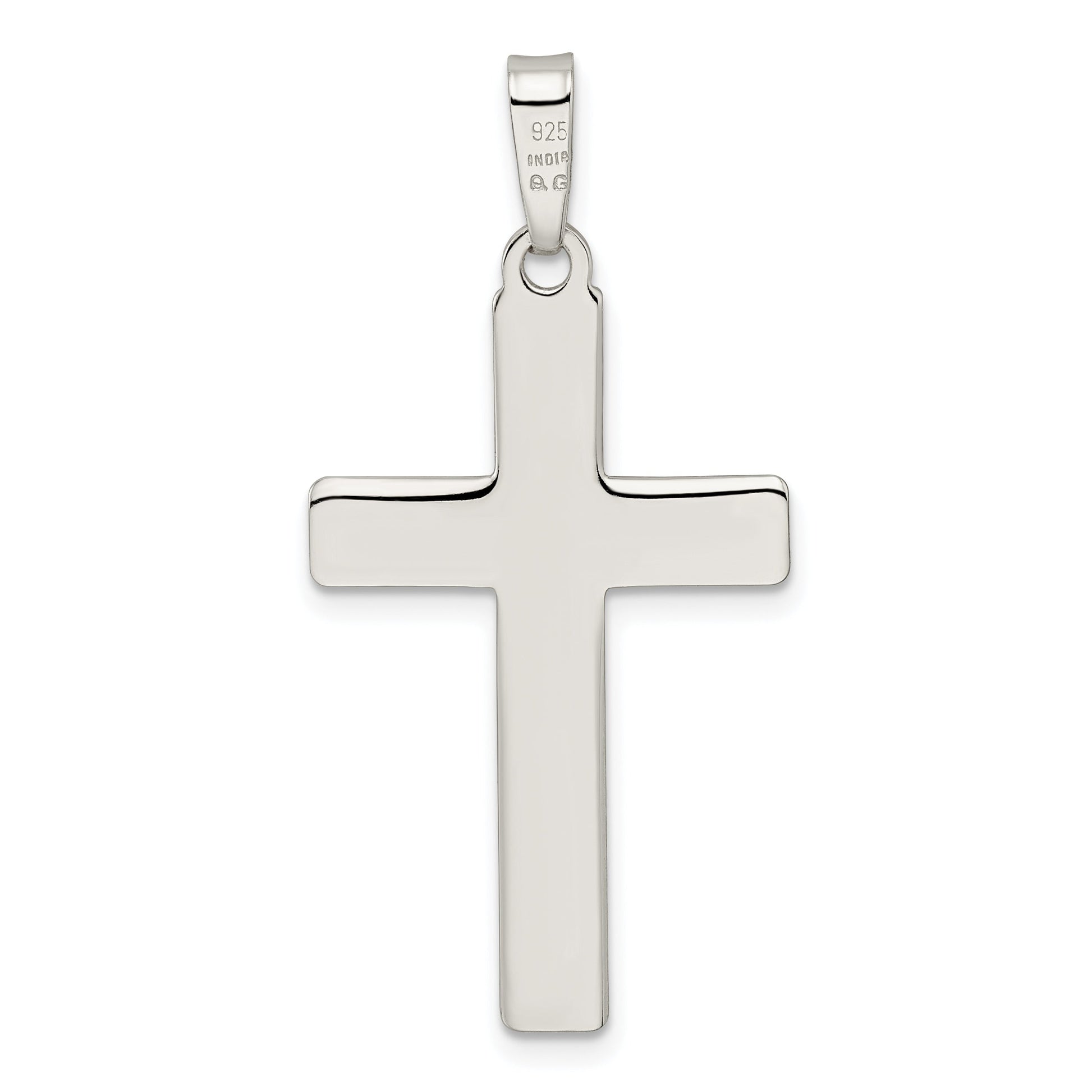 The Sterling Silver Diamond-Cut Latin Cross Pendant is a timeless piece for every jewelry lover. Crafted from 925 sterling silver, it gleams with a polished finish. Measuring 41.37 mm in length, the pendant showcases a detailed diamond-cut texture, offering a sophisticated shimmer. This unisex charm features a flat back design, with a width of 19.97 mm and a thickness of 1.4 mm, ensuring lightweight comfort. The anti-tarnish coating maintains its pristine look. Perfect as a standalone accessory or layered, the Sterling Silver Diamond-Cut Latin Cross Pendant suits any style.