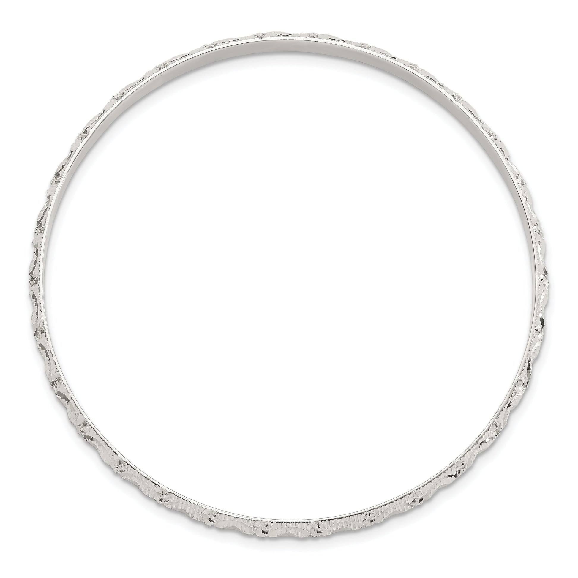 Discover the elegance of our Sterling Silver Diamond Cut Patterned Slip-On Bangle. Made from 925 sterling silver, this bangle exudes sophistication with its polished finish and diamond-cut texture. The easy-to-wear slip-on design ensures effortless style. Crafted using a skilled wire-forming process, this solid, white-toned accessory makes a lasting impression. The bracelet's 3.4 mm width adds to its sleek appeal, making it a versatile choice for any occasion. Whether dressing up or down, the Sterling Silver Diamond Cut Patterned Slip-On Bangle is a must-have for any jewelry collection.