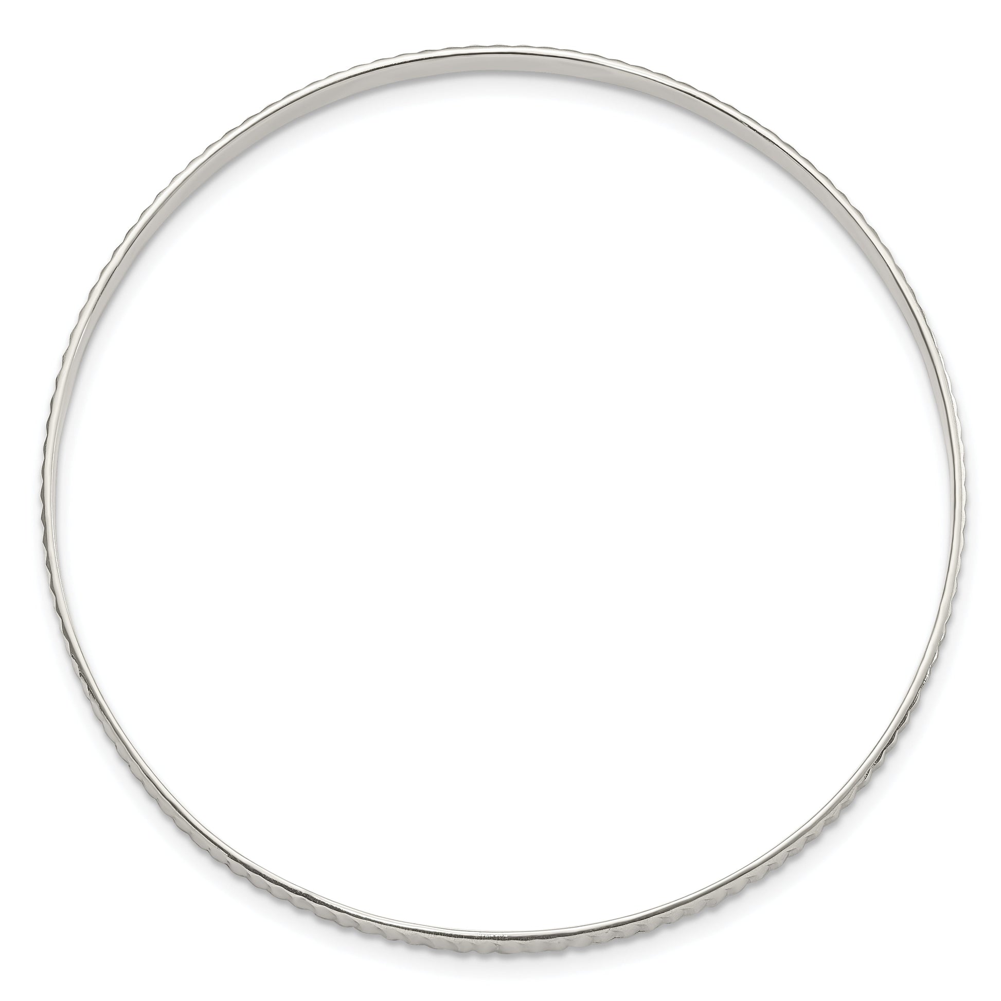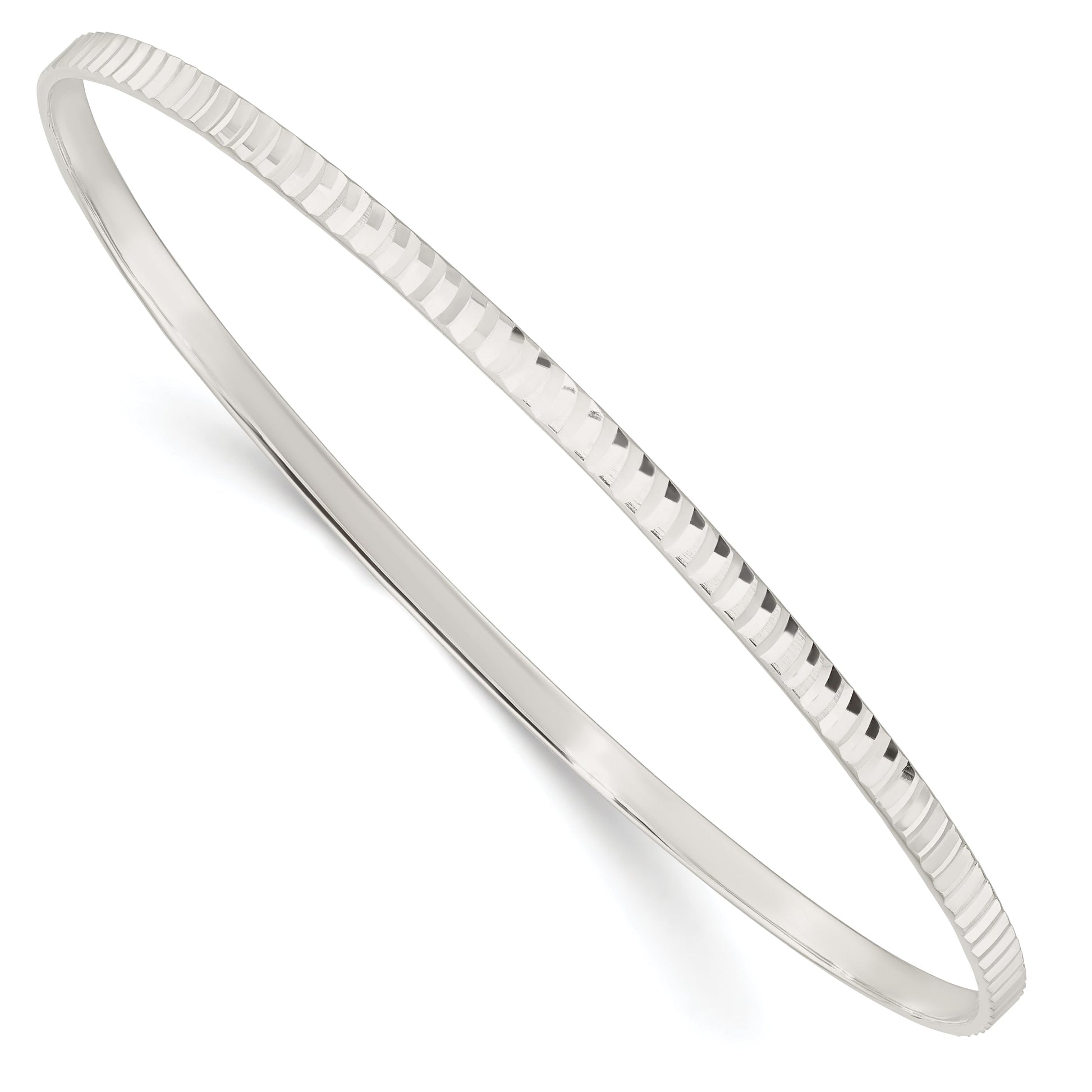 The Sterling Silver Diamond Cut Slip-On Bangle is an elegant piece that adds sparkle to any outfit. Expertly crafted from 925 sterling silver, this bangle showcases a polished finish that enhances its shine. Designed with a textured diamond-cut pattern, it catches the light beautifully. The slip-on style makes it easy to wear and remove, ensuring comfort and convenience without clasps. It measures 8 inches in length and 5 mm in width, making it a perfect fit for most wrists. This solid, white-toned accessory is an ideal choice for women who appreciate fine jewelry.