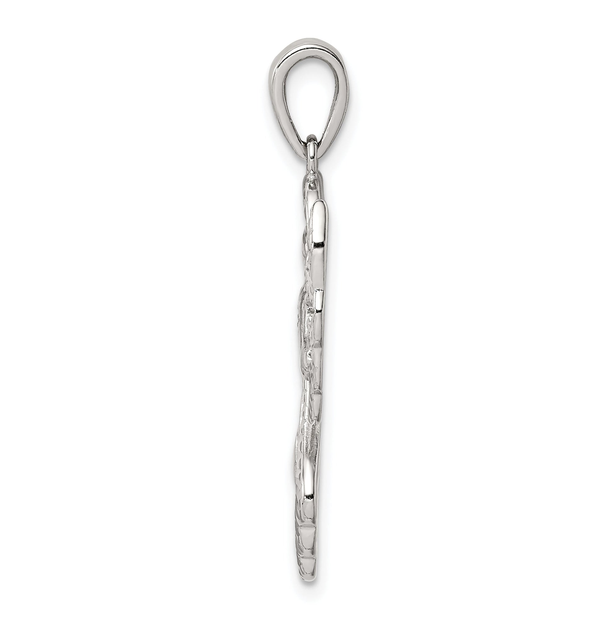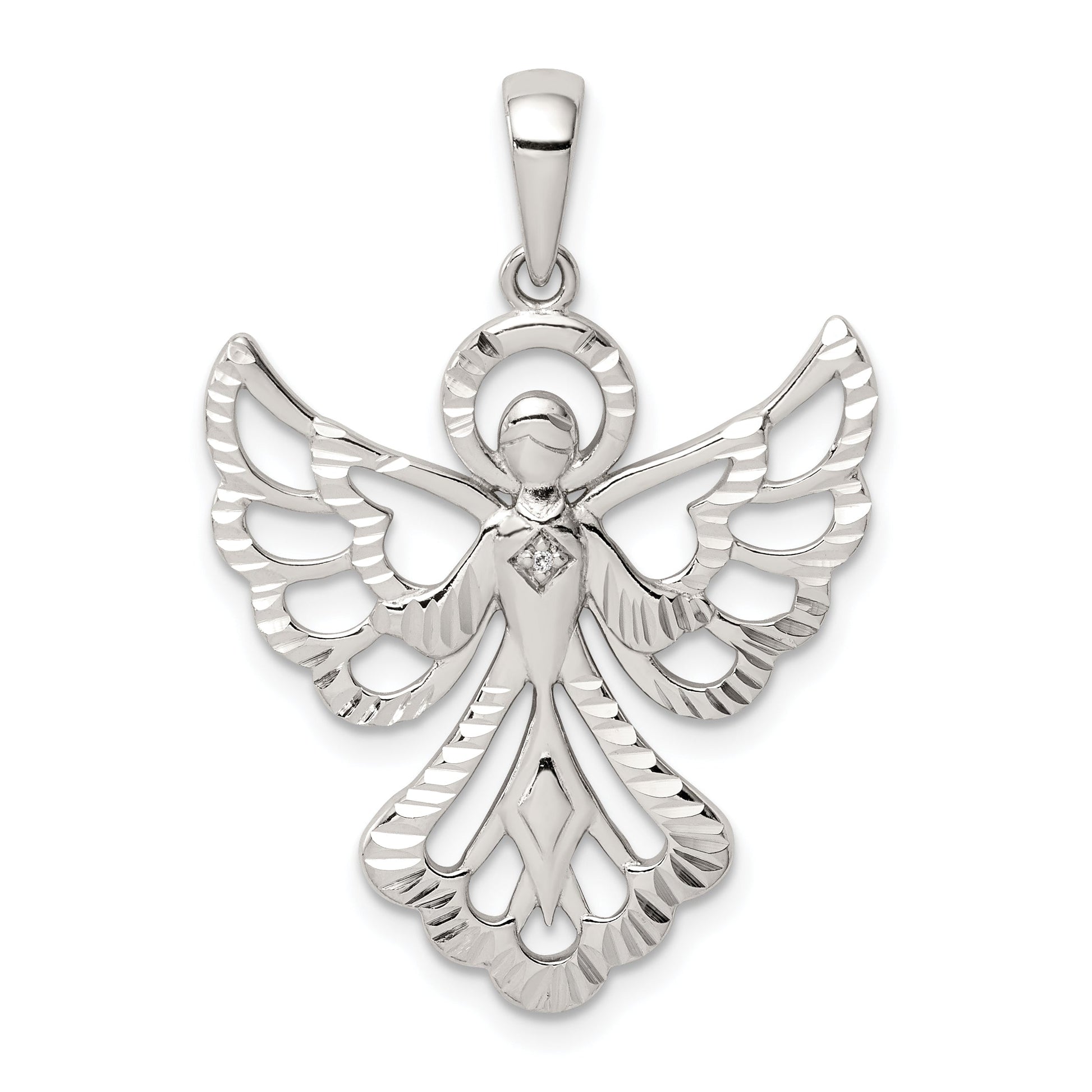Unveil your guardian spirit with our Sterling Silver Diamond & Diamond-Cut Angel Pendant. Crafted from 925 sterling silver, this dazzling pendant boasts a polished finish and a protective anti-tarnish coat. Its intricate angel design measures 31.8 mm in length, with a charm that captures shimmering elegance at 27.26 mm. A solid piece, it offers durability and style, with dimensions finely appointed to enhance its celestial allure. Sold individually, this pendant features a bail with a width of 2.75 mm, ensuring it hangs perfectly. Express faith and sophistication with this Sterling Silver Diamond & Diamond-Cut Angel Pendant.
