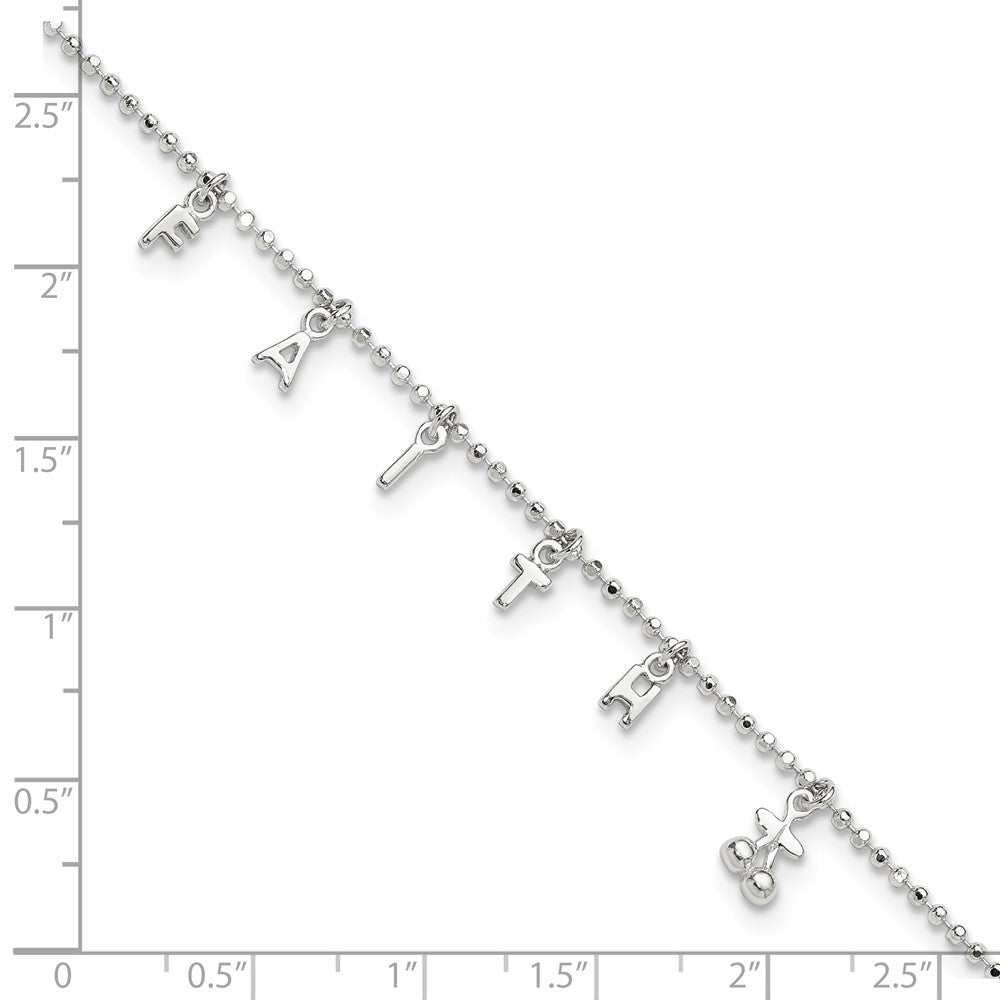 The Sterling Silver Faith 10In Plus 1In Ext. Anklet offers a blend of grace and durability. Crafted from sterling silver of 925 purity, its polished finish adds a sleek touch. This anklet measures 10 inches with a 1-inch extender for a snug fit. It flaunts a beaded ball chain, 1.5mm wide, with a spring-ring clasp ensuring secure wear. The anklet's charm adds a delicate accent with its 7mm by 6mm dimensions. Anti-tarnish coating makes this piece a reliable choice for everyday elegance. The Sterling Silver Faith Anklet is a must-have in every woman's jewelry collection.