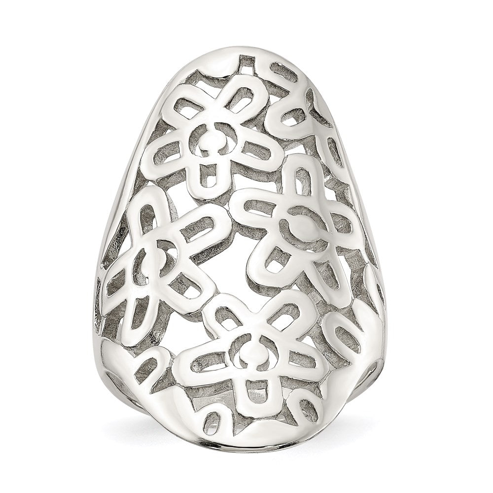 Introducing the Sterling Silver Flower Cut-Out Full Finger Ring, a must-have piece for any jewelry lover. Crafted from solid 925 sterling silver, this ring features a bold flower cut-out design that spells style and charm. Its polished finish adds a sleek shine, making it perfect to wear daily or for special dates. The ring's broad band, 5 mm wide, offers comfort and a sturdy feel on your finger. With a tall ring top measuring 33 mm by 20 mm, this piece stands out beautifully. Whether you're dressing up or adding a fun touch to your look, the Sterling Silver Flower Cut-Out Full Finger Ring is an eye-catching choice.