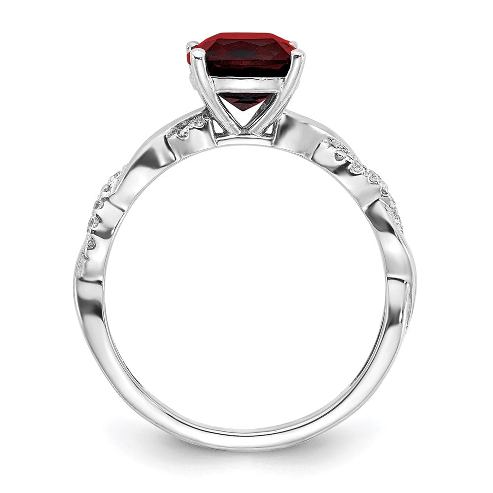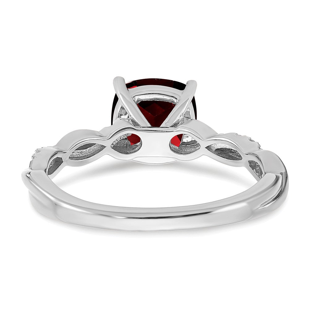 This beautiful piece of jewelry is a 'Sterling Silver Garnet and Diamond Ring' that is perfect for any occasion. Crafted with high-quality 925 sterling silver, this ring is polished to perfection, ensuring a beautiful shine. The ring features a cushion-cut garnet stone that is 7mm in size and has a weight of 1.965ct, along with 10 natural round diamonds that have a total weight of 0.005ct. The garnet stone has a deep red color that adds a vibrant and rich touch to the ring. The ring has a tapered band width of 1.75 to 3mm, making it an elegant addition to any finger. The ring is designed with an open back, making it comfortable to wear. This piece of jewelry is sold individually, making it a great gift for any special woman in your life. Whether it’s for special occasions or everyday wear, this ring is perfect for adding a touch of elegance to any outfit.