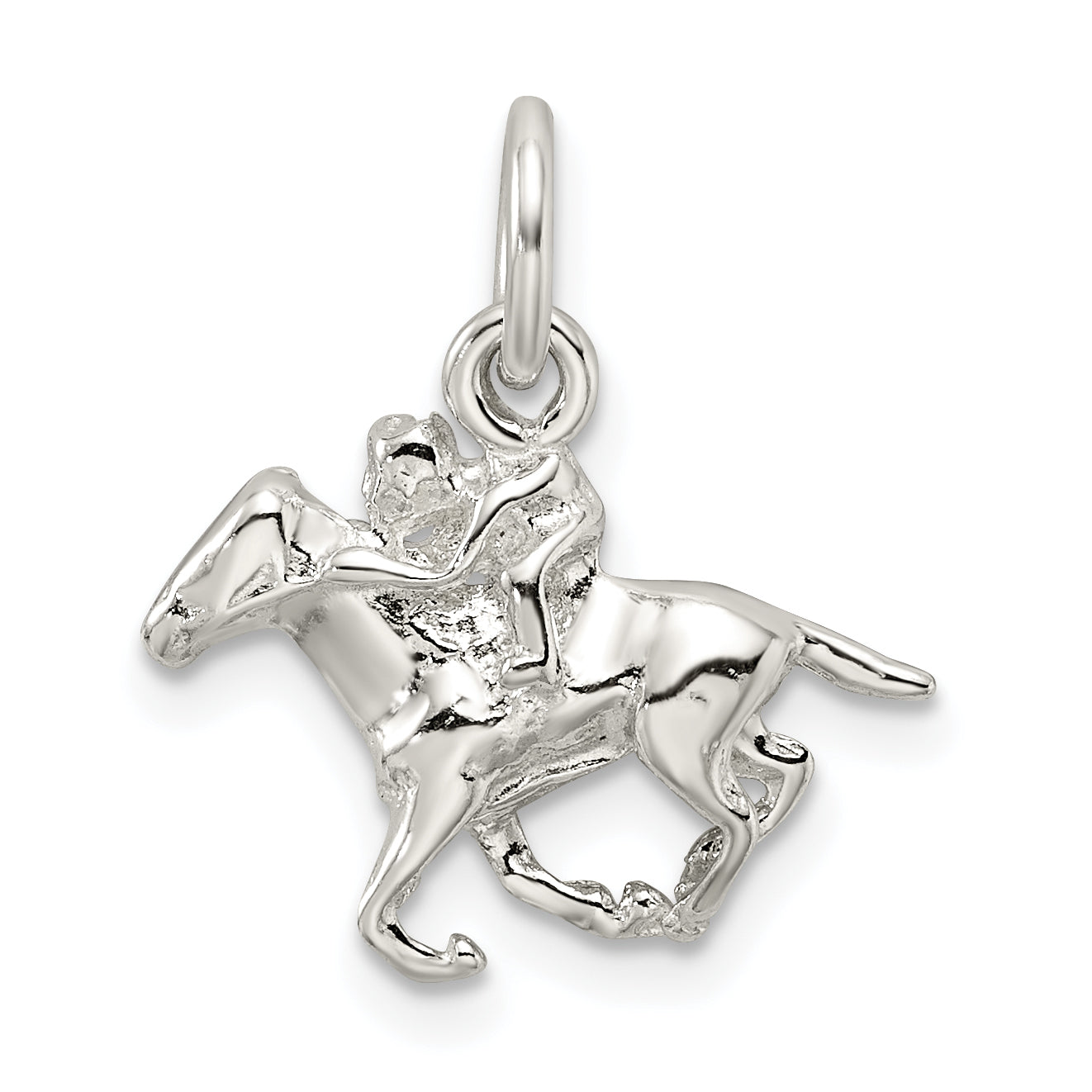 The Sterling Silver Horse with Rider Charm captures an equestrian spirit in shining 925 silver. This polished charm, perfect for horse enthusiasts, measures 15 mm in length and 17 mm in width, offering a striking 3D design. Its anti-tarnish coating keeps the charm looking pristine, while the casted manufacturing process ensures durability. The bail is 1 mm wide and 5 mm long, securing it easily to your favorite chain. This themed piece, crafted from white sterling silver, makes an ideal addition to any pendant or charm collection. Enhance your jewelry with the timeless allure of the Sterling Silver Horse with Rider Charm.