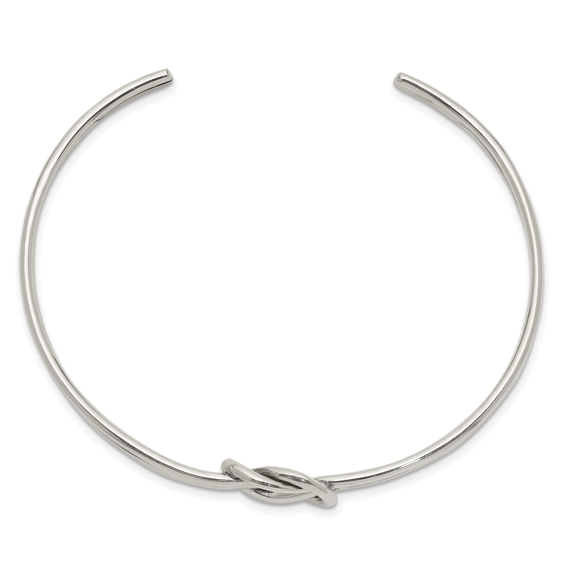 The Sterling Silver Knot Bangle is a stunning piece of fine jewelry that adds elegance and charm to any outfit. Made from high-quality 925 sterling silver, its polished finish shines brightly, catching the light effortlessly. The bangle features a unique knot design with a 14 mm length and 10 mm width, offering an intricate touch that stands out. This women's bangle is designed for ease with a slip-on fit, eliminating the need for a clasp. With its sleek 3 mm chain width, the Sterling Silver Knot Bangle seamlessly combines sophistication with style, making it a timeless addition to your jewelry collection.