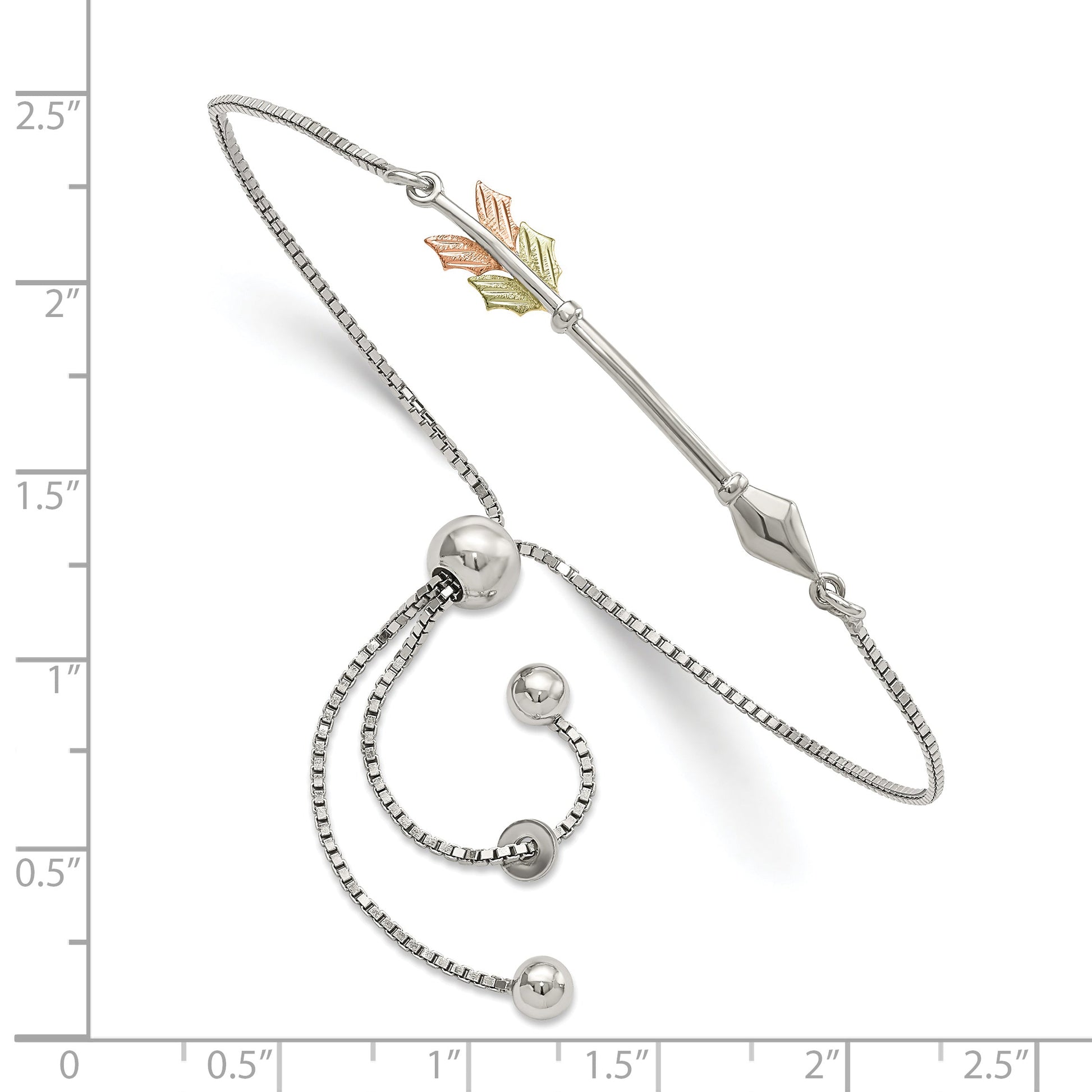 Introducing the stunning Sterling Silver Landstrom's Mount Rushmore Black Hills Bracelet. This piece combines elegance and versatility with its adjustable design and unique blend of materials. It features polished 925 sterling silver with striking 12K gold accents in both gold and rose tones. The arrow charm adds a modern twist to a classic piece, measuring 34 mm in length and 5 mm in width. Slip it on effortlessly and enjoy how it complements any outfit. Packaged in a gift box, this beautiful bracelet makes for a thoughtful gift or a chic addition to your own collection.