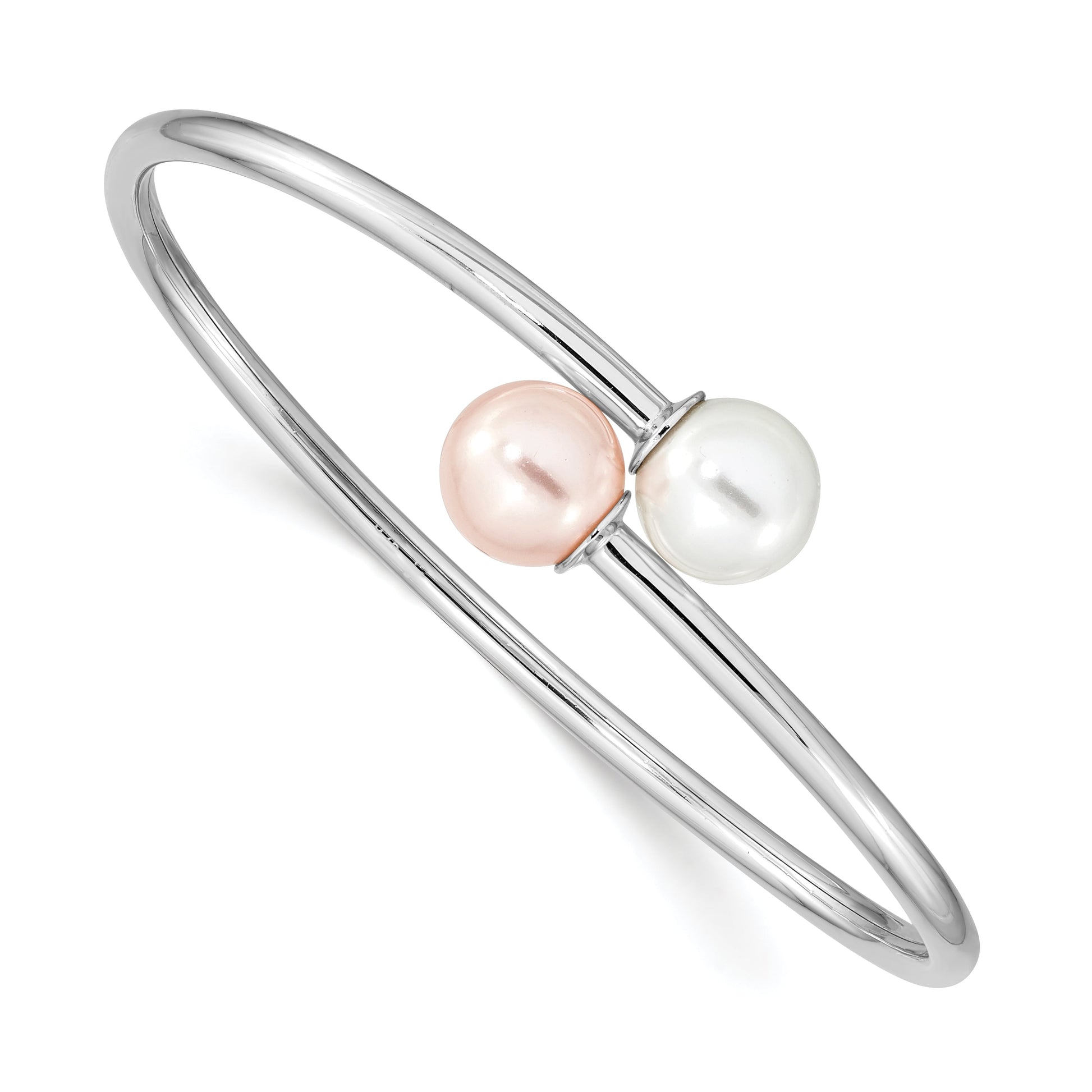 The Sterling Silver Majestik Rhodium-Plated Bangle is a statement of elegance and charm. Crafted in 925 sterling silver, it features stunning 10-11mm white and pink imitation shell pearls. Rhodium plating enhances its shine and durability. The bangle's 7-inch length fits smoothly with its slip-on design, while round pearls and silver tone add sophistication. Perfect for any occasion, its hollow tubing construction ensures lightweight comfort. Treat yourself or someone special to this exquisite piece, attractively packaged in a gift pouch. The Majestik Bangle exudes timeless beauty, transforming any outfit into a masterpiece.