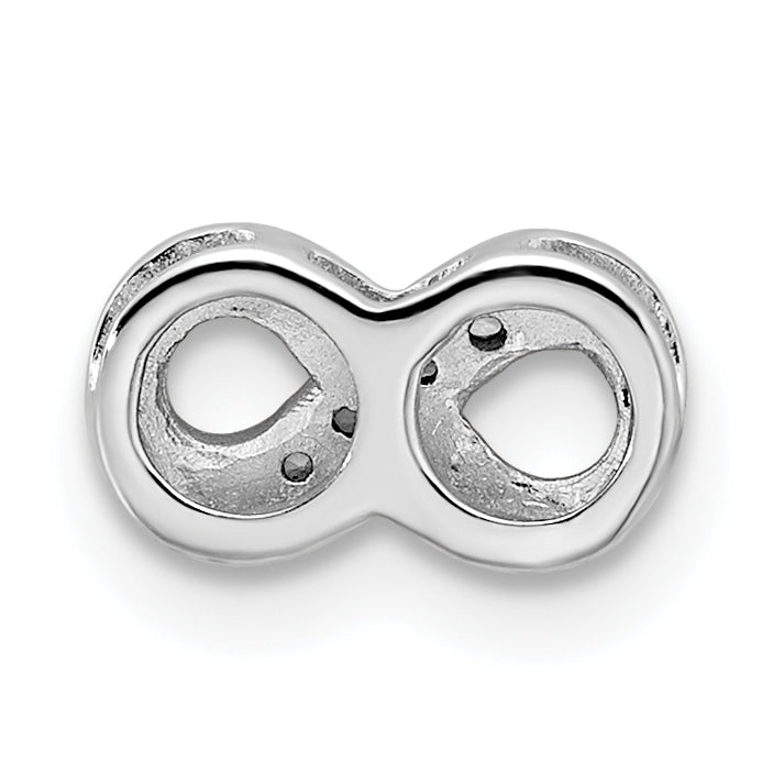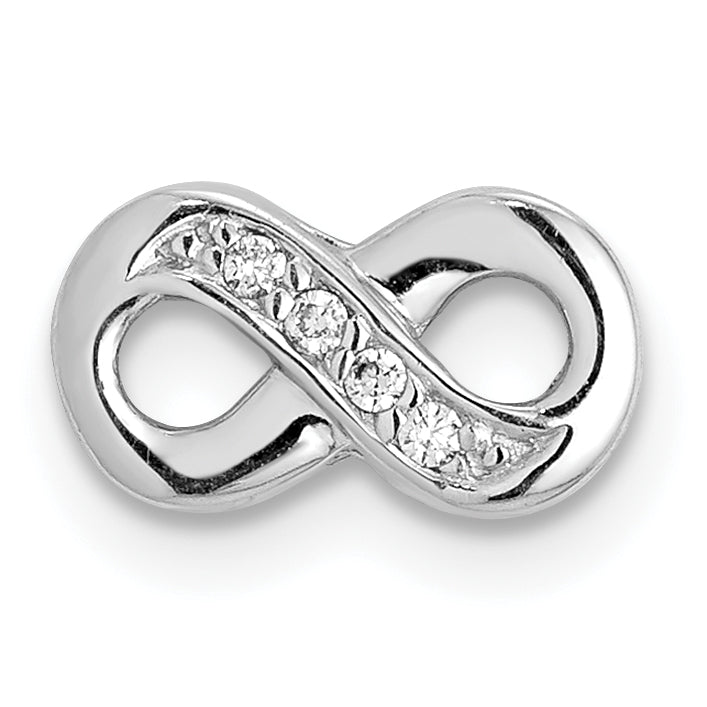 The Sterling Silver Notes Rhodium Plated Cz Infinity Slide Charm adds a touch of timeless elegance to your collection. Crafted from 925 sterling silver, this charm features a rhodium plating for lasting shine. The centerpiece—a sparkling, clear cubic zirconia—draws the eye and captures light beautifully. Casted with precision, this solid charm ensures durability. Perfect for pendants, it seamlessly enhances any ensemble with its silver-tone class. The synthetic stone mirrors the allure of diamonds at a glimpse. The Sterling Silver Notes Rhodium Plated Cz Infinity Slide Charm is your next favorite accessory.