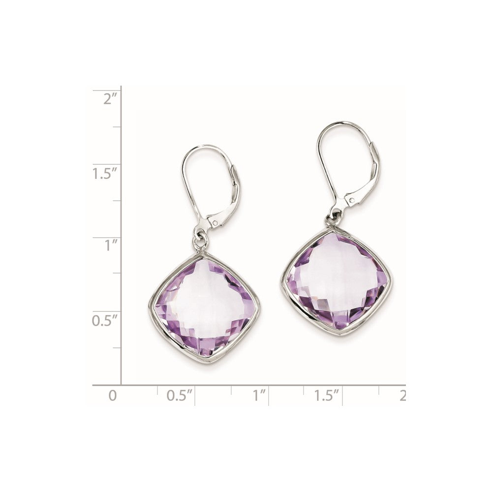 These are a stunning pair of earrings called "Sterling Silver Pink Quartz Earrings". Made with high-quality 925 sterling silver, these earrings showcase two cushion-cut Rose de France Amethyst stones with a size of 15mm each, weighing 11.700 ct in total. The earrings measure 38mm in length and 19mm in width, making them the perfect size to accentuate any outfit for any occasion. They feature a lever-back closure for easy wear and take-off, and their drop and dangle design complements the natural shape of the ear. These earrings are an ideal gift for any woman who loves classic and elegant jewelry pieces.