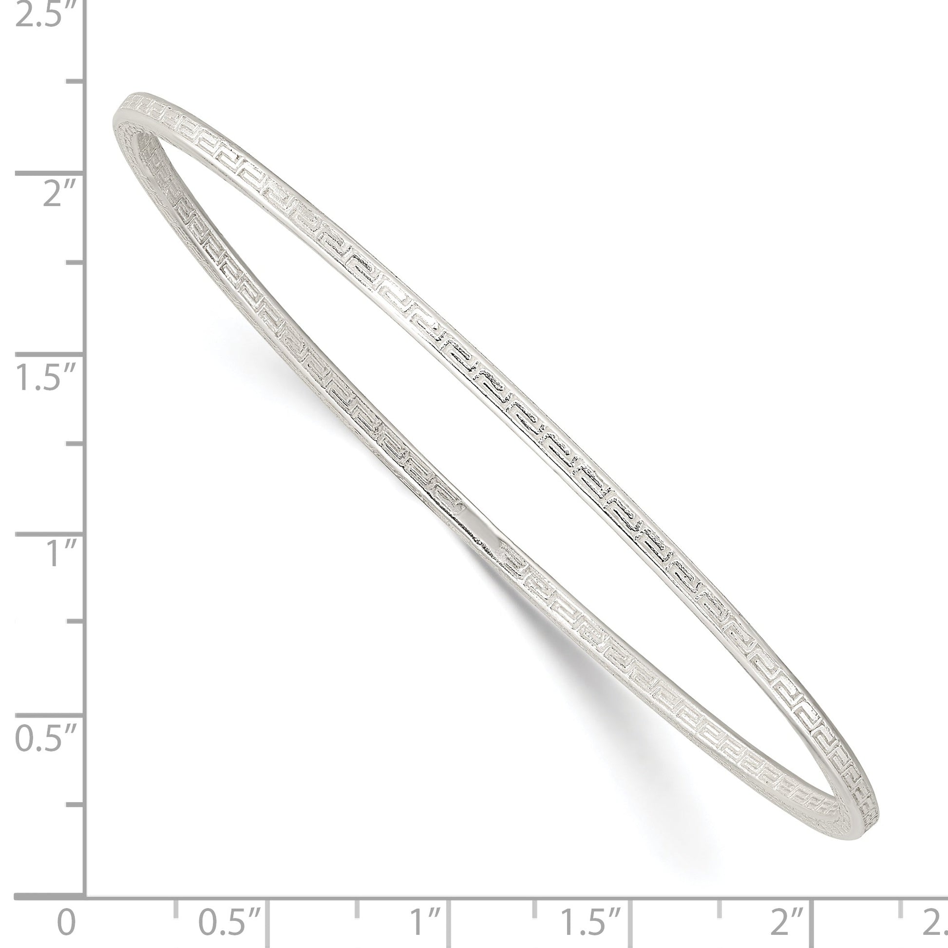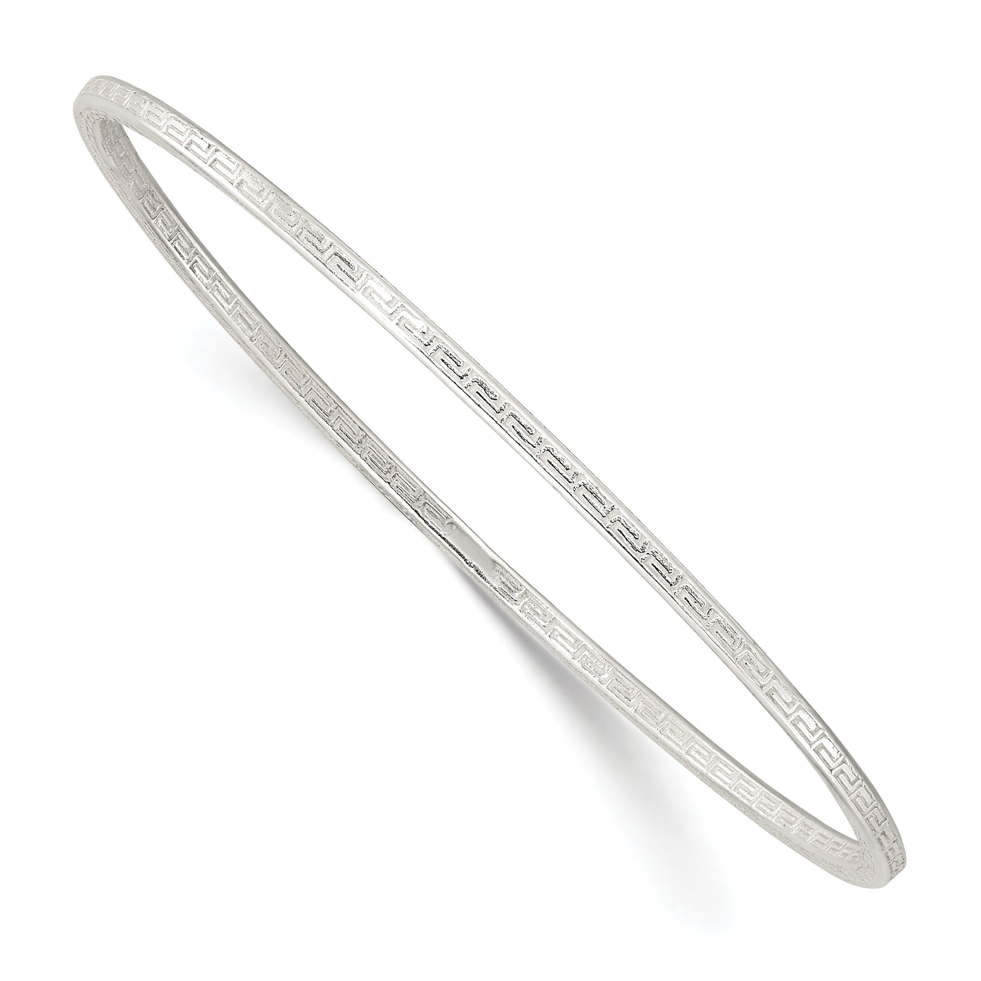 The Sterling Silver Polished 2.25mm Greek Key Slip-On Bangle brings timeless elegance to any outfit. Crafted from 925 sterling silver, this bangle boasts a sleek, polished finish, gleaming with sophistication. Its 2.25 mm width showcases the intricate Greek Key design, symbolizing eternity and unity, perfect for any occasion. Designed without a clasp, it slips on easily, providing both comfort and style for women's jewelry collections. This solid sterling silver bangle makes a graceful statement, blending classic charm with modern flair. Elevate your wrist with the Sterling Silver Polished 2.25mm Greek Key Slip-On Bangle today.