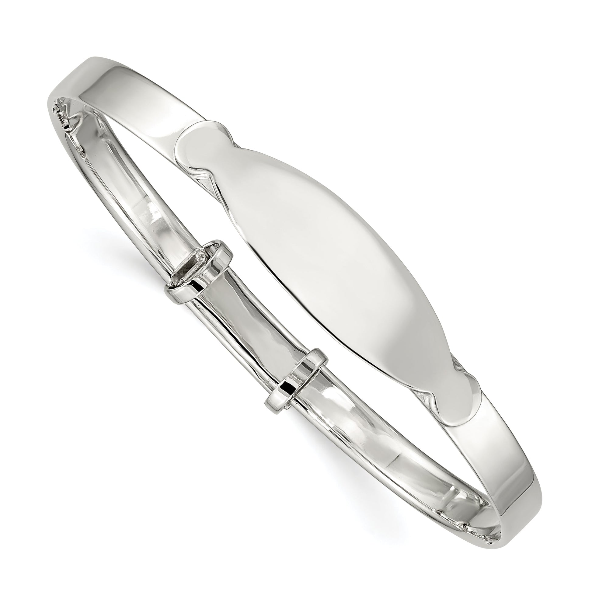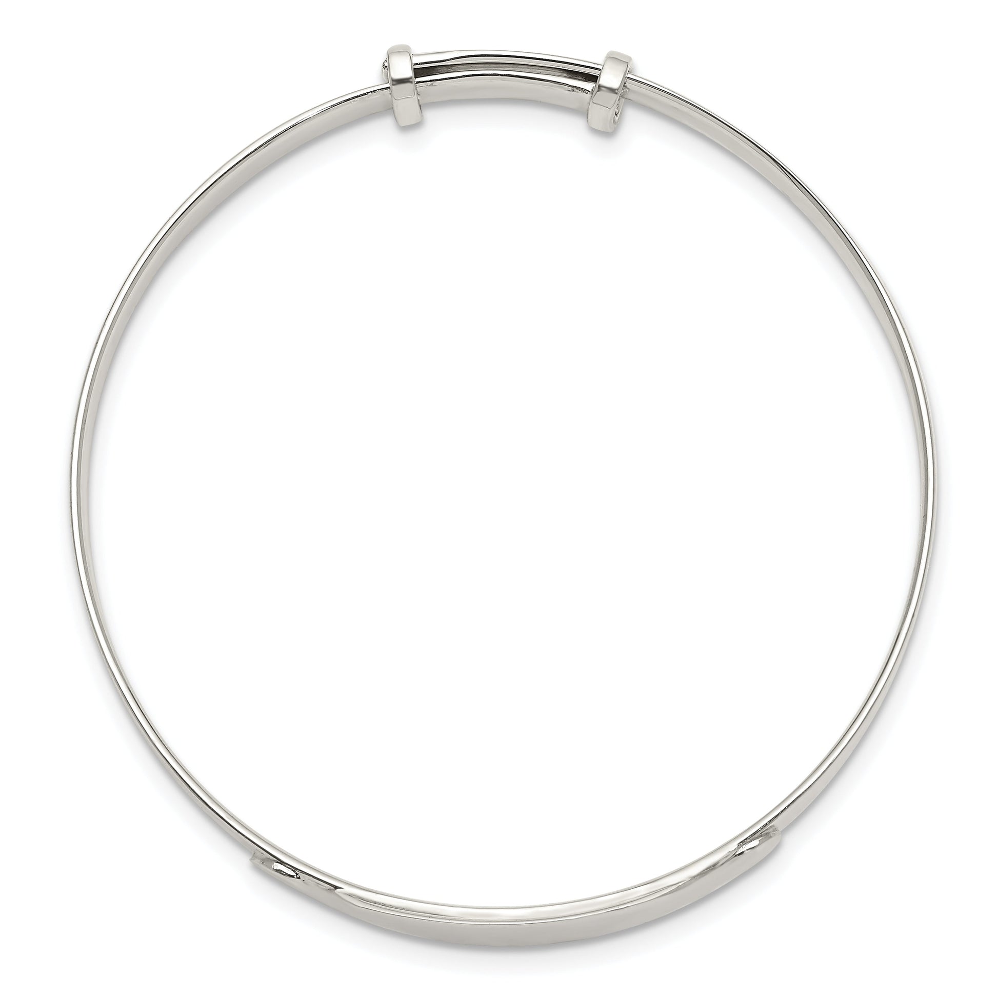 Introducing the Sterling Silver Polished Adjustable ID Baby Bangle Bracelet, a charming keepsake for any little one. Crafted from genuine sterling silver with a sleek 925 purity, this bracelet shines with its polished finish. Designed for little wrists, it features a clever slip-on design, making it simple to put on and take off. The solid construction ensures durability, while the adjustable feature allows for a perfect fit as your child grows. Plus, personalize it with an engraving to mark a special date or name. The Sterling Silver Polished Adjustable ID Baby Bangle Bracelet is a treasured gift for girls that lasts a lifetime.