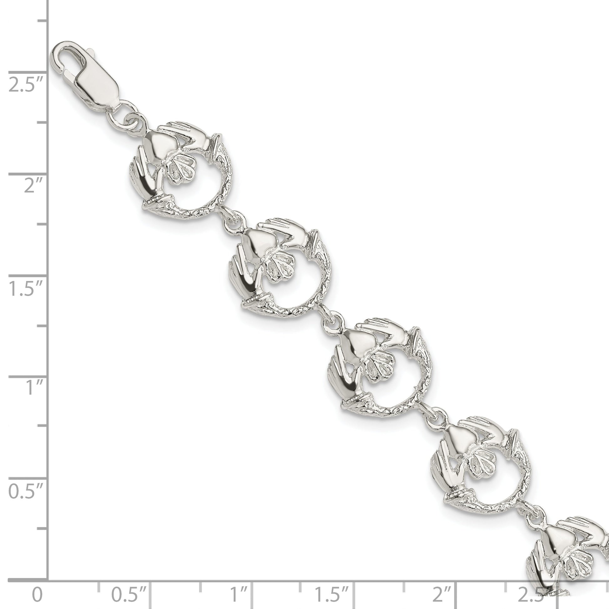 The Sterling Silver Polished and Textured Claddagh Link Bracelet is an exquisite piece of fine jewelry that stands out in any collection. Crafted with 925 sterling silver, its polished finish and unique Claddagh design offer a blend of tradition and modern style. Measuring 7 inches, this bracelet fits comfortably on the wrist, highlighted by its fancy chain type and 14 mm width. A secure lobster clasp ensures it stays in place, making it perfect for everyday wear or special occasions. Elevate your style with the Sterling Silver Polished and Textured Claddagh Link Bracelet.