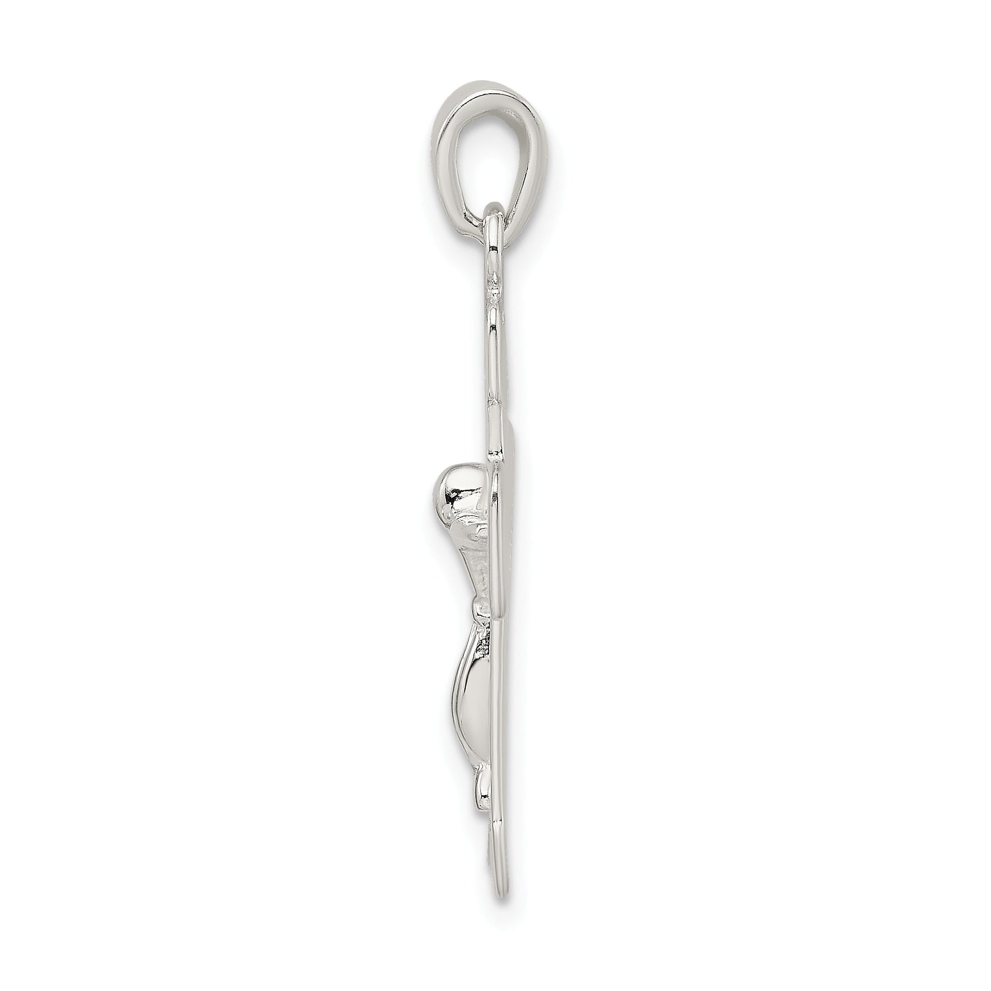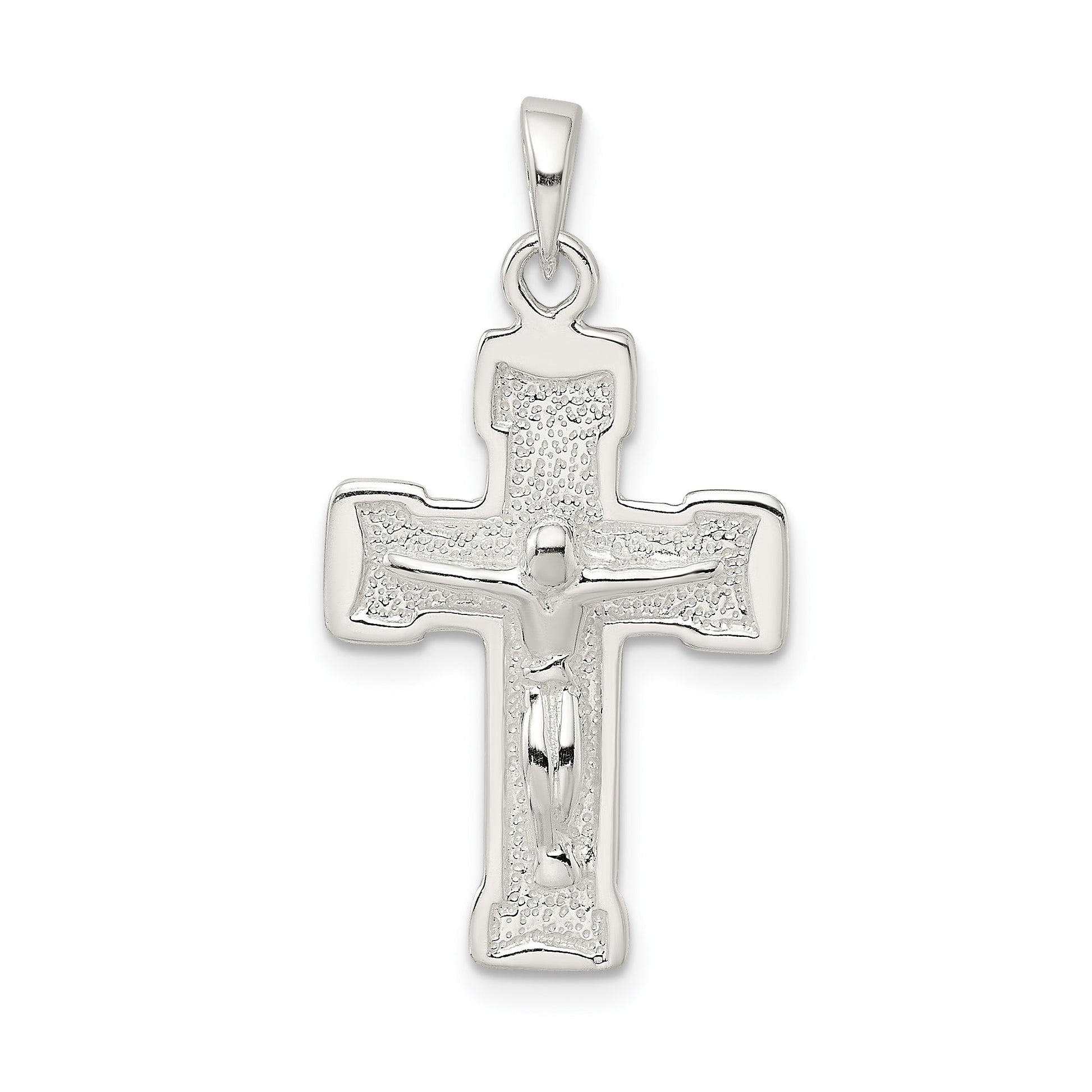 The Sterling Silver Polished and Textured Crucifix Pendant is a divine emblem you can wear every day. Crafted with 925 sterling silver, this polished beauty boasts a 3D design that effortlessly captures attention. At 37.6 mm in length, this pendant makes a statement without overwhelming your look. Its textured details add depth, while the solid construction ensures longevity. With its flat back profile, it rests comfortably against your skin. A perfect blend of elegance and faith, the Sterling Silver Polished and Textured Crucifix Pendant is a must-have in your jewelry collection.