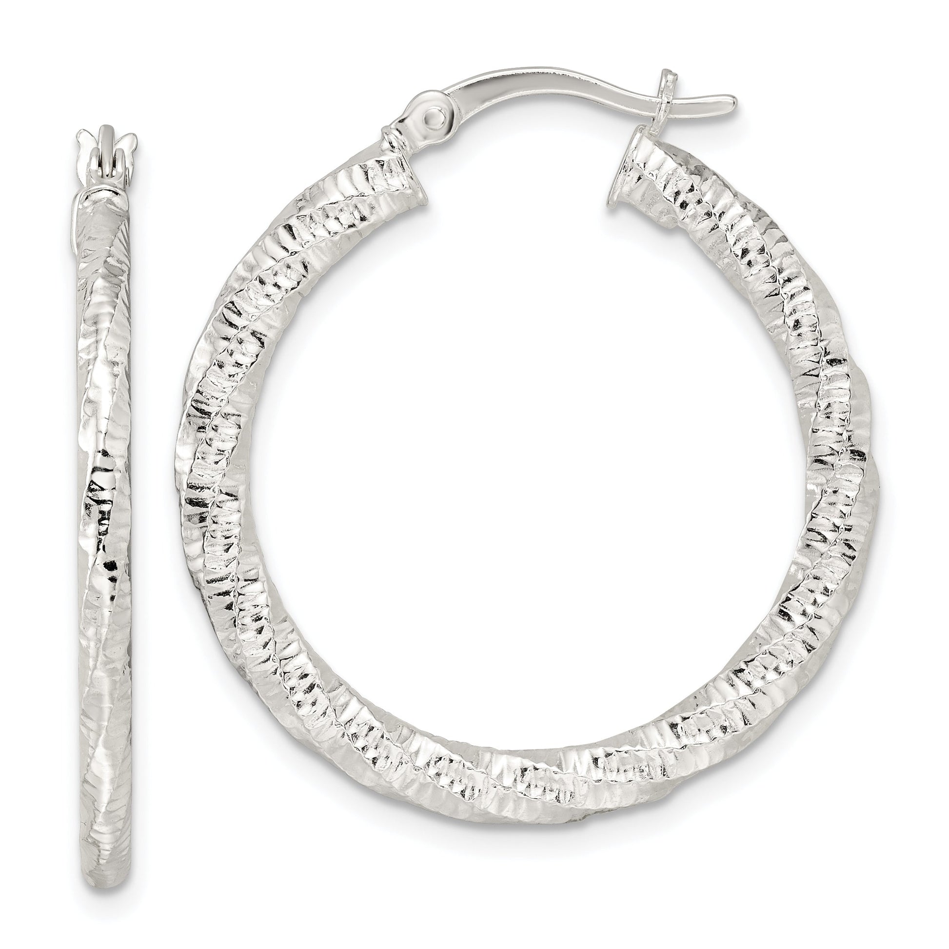 Bring a touch of elegance to your style with these Sterling Silver Polished and Textured Twisted Hoop Earrings. Crafted from 925 sterling silver, these hoops blend a polished finish with textured twists, giving them a unique look that catches the eye. Measuring 32.3mm in length and 30.3mm in width, they offer just the right balance of boldness and sophistication. The hinged design ensures ease of wear, while the wire and clutch closure keep them secure. Perfect for any occasion, these timeless earrings add a lovely charm to any outfit. Indulge in these Sterling Silver Polished and Textured Twisted Hoop Earrings and elevate your jewelry collection.