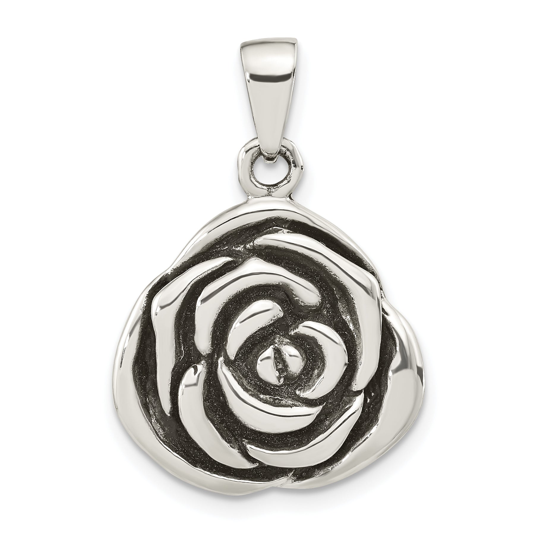 Discover the Sterling Silver Polished Antiqued Rose Pendant, a timeless addition to any jewelry collection. Made from high-quality 925 sterling silver, this exquisite piece boasts a polished and antiqued finish, offering a vintage charm with a modern twist. The pendant measures 27.2 mm in length and features a detailed rose design that is textured and concave, providing depth and elegance. Perfect for any occasion, this women's themed pendant is a versatile accessory. With its 20 mm width, it pairs beautifully with a variety of chains. The Sterling Silver Polished Antiqued Rose Pendant is designed to be a showstopper.