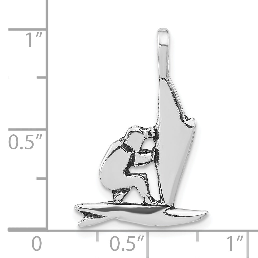 Elevate your style with the Sterling Silver Polished & Antiqued Windsurfer Chain Slide Pendant. Crafted from 925 sterling silver, this pendant showcases a striking blend of polished and antiqued finishes. The intricate design measures 25.75 mm in length and 17.25 mm in width, making it a perfect statement piece for any outfit. Its themed motif offers a unique touch, suitable for any gender. This unisex charm flaunts a white, lustrous shine, providing an eye-catching addition to any jewelry collection. Own the waves with the Sterling Silver Polished & Antiqued Windsurfer Chain Slide Pendant.