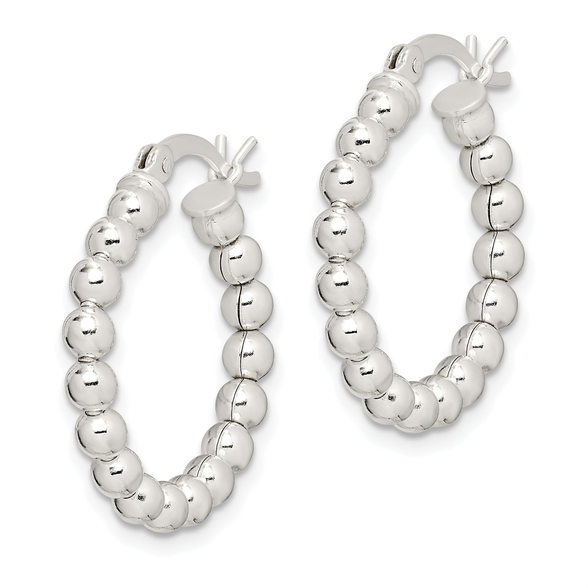 Check out the Sterling Silver Polished Beaded Hoop Earrings, crafted with care and style in mind. These earrings boast 925 sterling silver and a polished, anti-tarnish finish to ensure they keep gleaming for years. Each earring measures 24 mm in length and 23 mm in width, perfectly sized for a chic look. The beaded texture adds a unique touch, making them stand out in your collection. Designed as a pair for women, these hollow hoops use a wire and clutch for secure wear. Elevate your look with the Sterling Silver Polished Beaded Hoop Earrings.