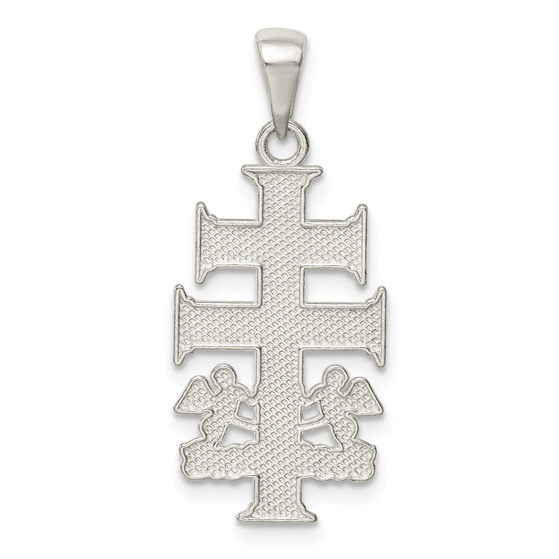 The Sterling Silver Polished Caravaca Double Cross with Angels Crucifix Pendant is a stunning piece that captures the essence of elegance and charm. Crafted from 925 sterling silver, this pendant shines with its polished finish. It measures 20.63 mm in length and 12.4 mm in width, featuring an anti-tarnish coating that ensures lasting brilliance. The pendant showcases a solid, casted design with a textured back, giving it a unique touch. This themed jewelry is perfect for those who appreciate intricate details. Add the Sterling Silver Polished Caravaca Double Cross with Angels Crucifix Pendant to your collection for timeless style.