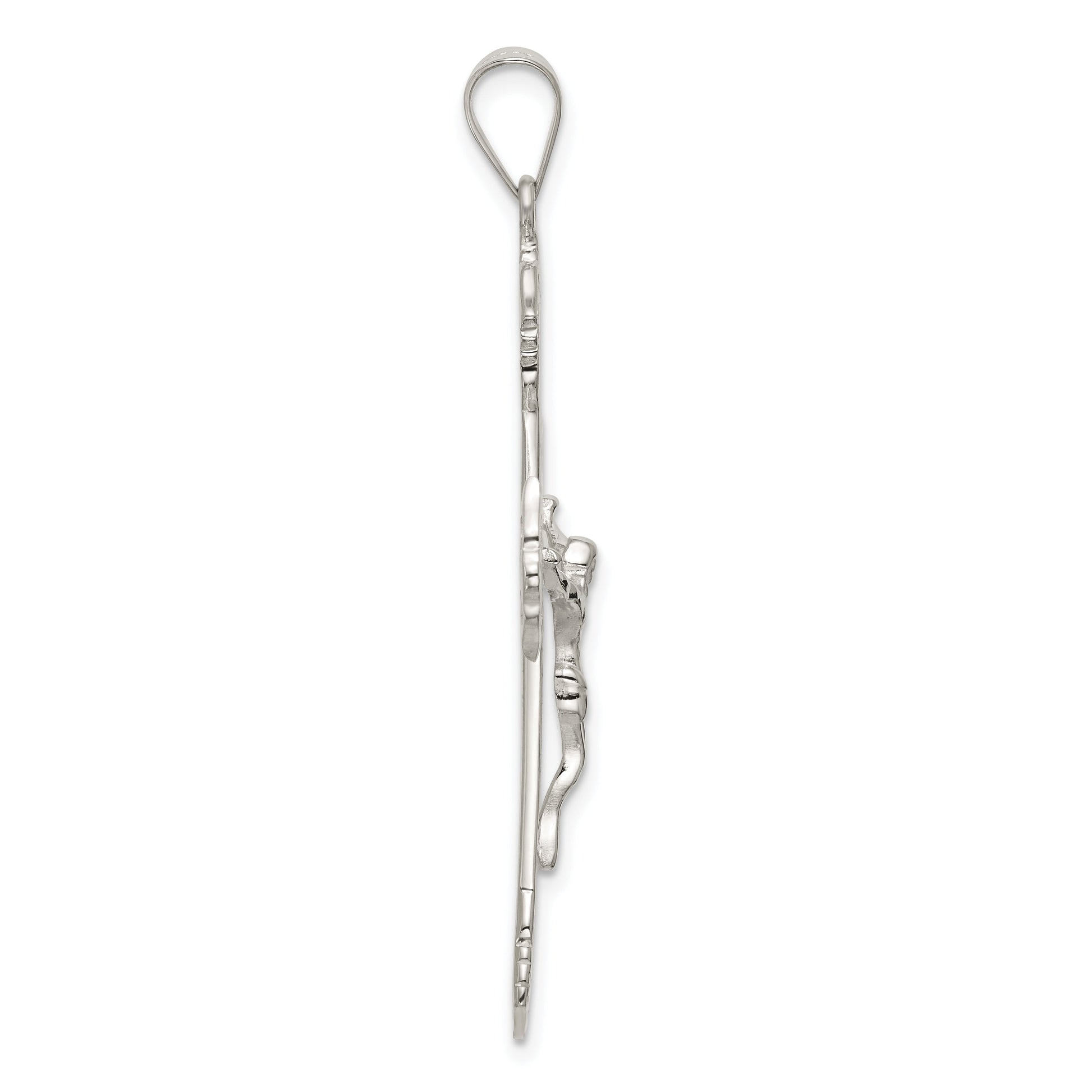 Introducing the Sterling Silver Polished Crucifix Pendant, a stunning piece that grabs attention. Crafted from 925 sterling silver, this pendant has a sleek polished finish that gleams with sophistication. Its substantial size, measuring 54.25 mm in length and 29.75 mm in width, ensures it's a prominent addition to any neckline. The flat-back profile adds comfort, while the casted manufacturing promises durability. With an anti-tarnish coating, this pendant retains its lustrous shine over time. This piece fuses elegance and faith, making the Sterling Silver Polished Crucifix Pendant a cherished addition to your jewelry collection.