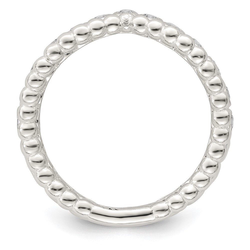 Introducing the Sterling Silver Polished CZ Beaded Double Fancy Ring, a striking piece for women who love bold designs. This ring features a polished sterling silver band with a textured finish that adds depth. It showcases 13 round cubic zirconia stones in a white hue, set in a double-layer style that gives it a fancy look. The tapered band measures from 5.86 to 7.70 mm, offering a comfortable fit. Anti-tarnish coating keeps the shine bright. Perfect for special occasions or everyday wear, the Sterling Silver Polished CZ Beaded Double Fancy Ring combines style and durability with its synthetic stones and quality silver.