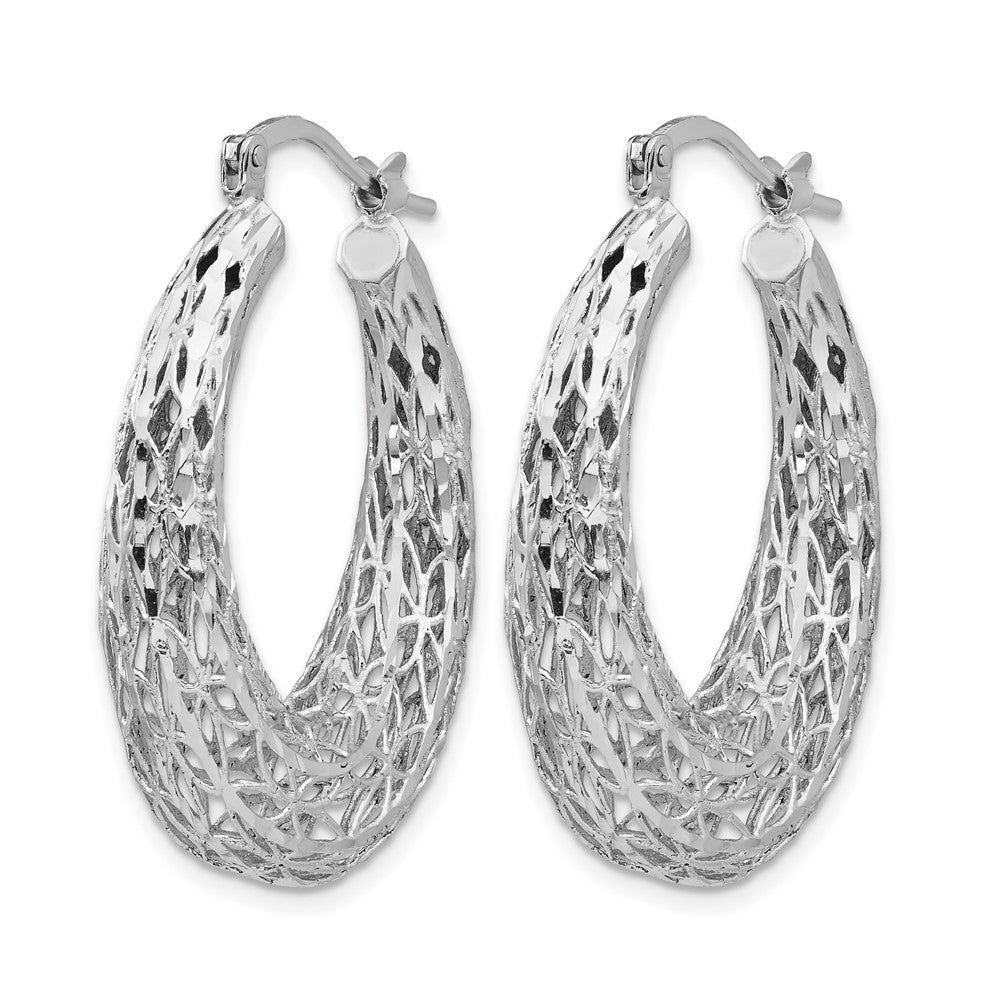 The Sterling Silver Polished Diamond-Cut Oval Hoop Earrings capture elegance and style in a unique design. Crafted from high-quality 925 sterling silver, they boast a polished finish with rhodium plating, ensuring a long-lasting shine. The hoops measure 32.79 mm in length and 22.45 mm in width, offering a striking presence. The hollow design, achieved through laser-cut technology, keeps them lightweight for all-day comfort. The diamond-cut texture reflects light beautifully, enhancing their allure. Secured with a wire and clutch closure, these hoops promise to be a timeless addition to your jewelry collection. Invest in these Sterling Silver Polished D/C Oval Hoop Earrings today and flaunt their enduring beauty.