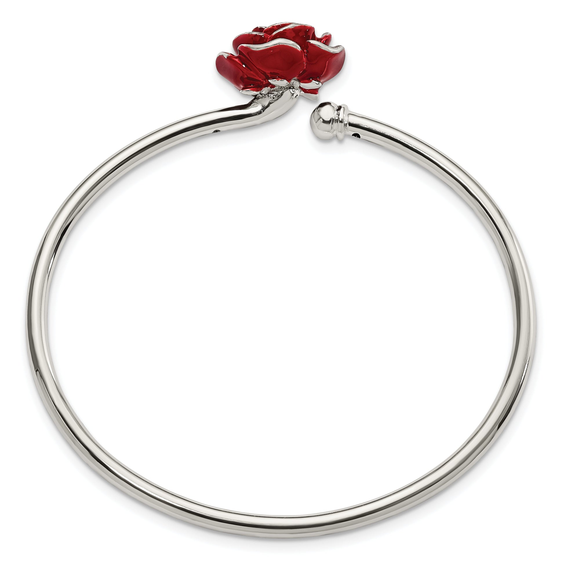 The Sterling Silver Polished Enameled Rose Flexible Bangle captivates with its delicate artistry and elegant design. Crafted from high-quality 925 sterling silver, this bangle shows a polished, white finish that's bright against the vivid red enamel rose charm. The 3D rose measures 15.75 mm in length and 16.45 mm in width, making a statement while remaining subtle. The flexible cuff is easy to slip on, making it a practical choice for any occasion. Whether you're dressing up or keeping it casual, this beautiful piece will elevate any look. The Sterling Silver Polished Enameled Rose Flexible Bangle is sure to become a favorite in your collection.