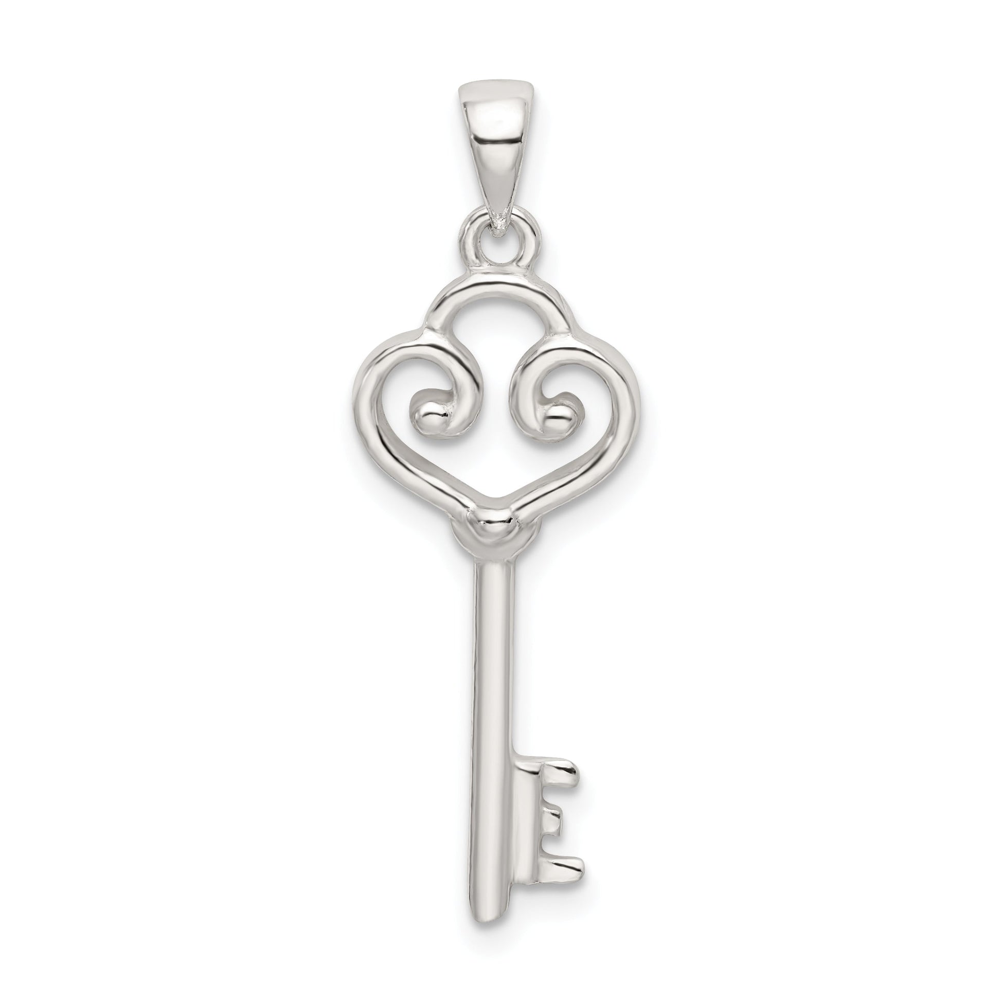 Introducing the Sterling Silver Polished Heart Key Pendant—a true gem in fine jewelry. Crafted in 925 sterling silver, this pendant offers a polished, sleek finish. The pendant is 32.7 mm long and features a heart key design, making it a timeless piece. With anti-tarnish coating, this tear-resistant emblem stays radiant over time. Measuring 11 mm wide and 2.1 mm thick, it boasts a flat back profile for a comfortable fit. Sold individually, it complements any outfit. The Sterling Silver Polished Heart Key Pendant is more than an accessory; it's a statement.