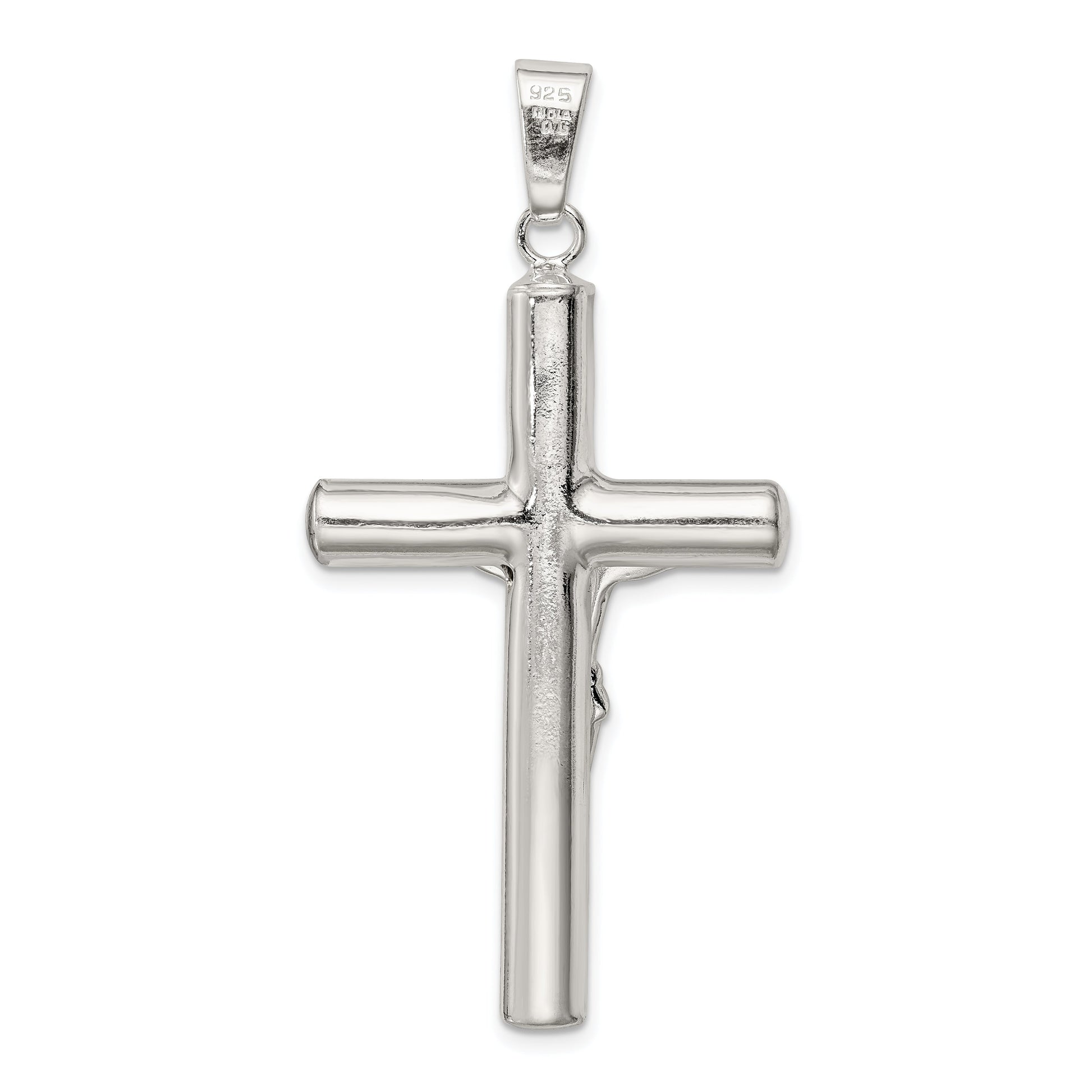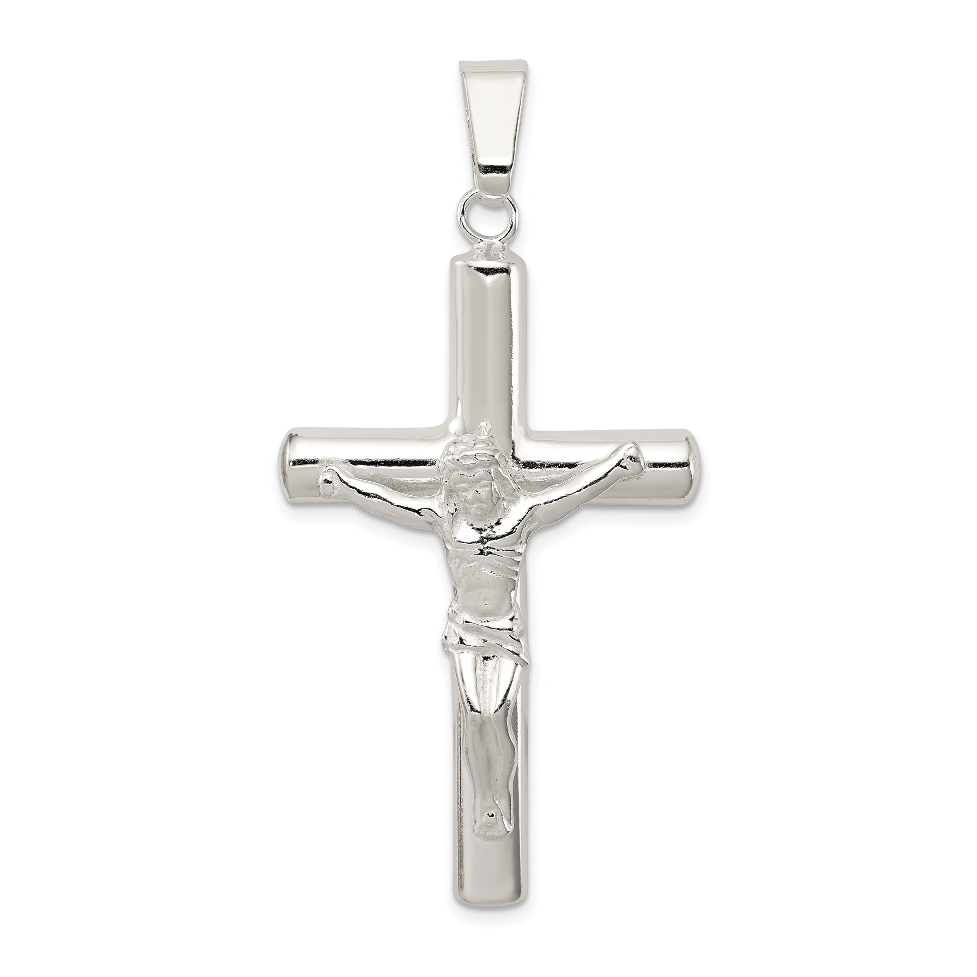 The Sterling Silver Polished Hollow Crucifix Cross Pendant combines elegance and craftsmanship in one exquisite piece. Made from high-quality 925 sterling silver, this pendant boasts a polished finish that gleams with sophistication. Its dimensions are impressive, with a length of 56mm, width of 27.50mm, and a thickness of 8.75mm, all contributing to its substantial presence. The pendant is hollow, providing a lightweight feel, and features an anti-tarnish coating to maintain its pristine appearance. Expertly crafted through stamping, this themed jewelry is not just a pendant but a statement of faith and style. The Sterling Silver Polished Hollow Crucifix Cross Pendant is a timeless addition to any jewelry collection.