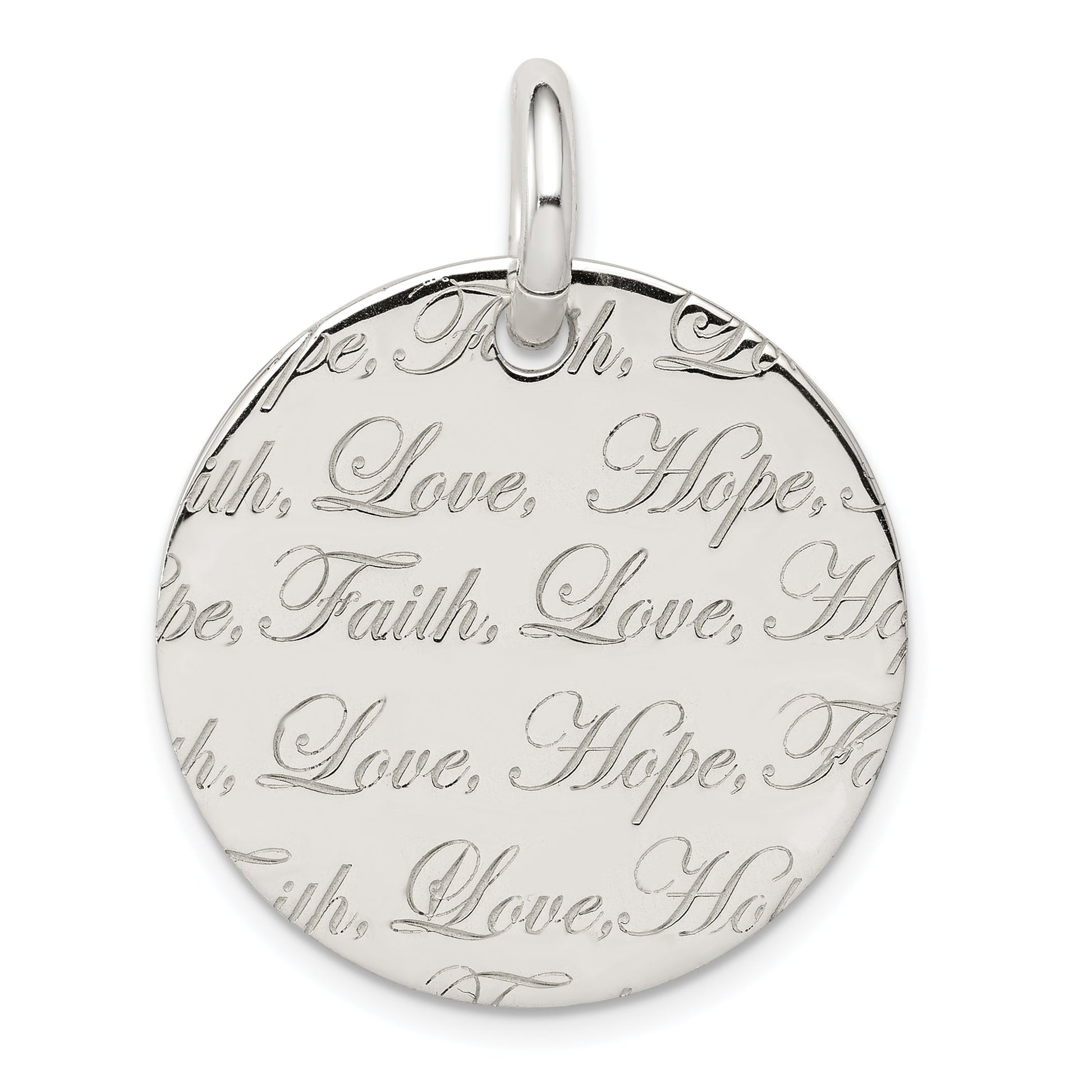 Introducing the Sterling Silver Polished 'Love, Hope, Faith' Engraved Pendant, a beautiful piece crafted from quality 925 sterling silver. This eye-catching pendant measures 31.6 mm in length with detail measuring 24.84 mm by 24.74 mm. Its polished surface and anti-tarnish coating enhance its durability and shine. Created through expert stamping techniques, each pendant is a solid and lasting treasure. The sterling silver boasts a white hue that complements any outfit, making it an essential addition to your jewelry collection. Celebrate the message of love, hope, and faith with this exquisite pendant.