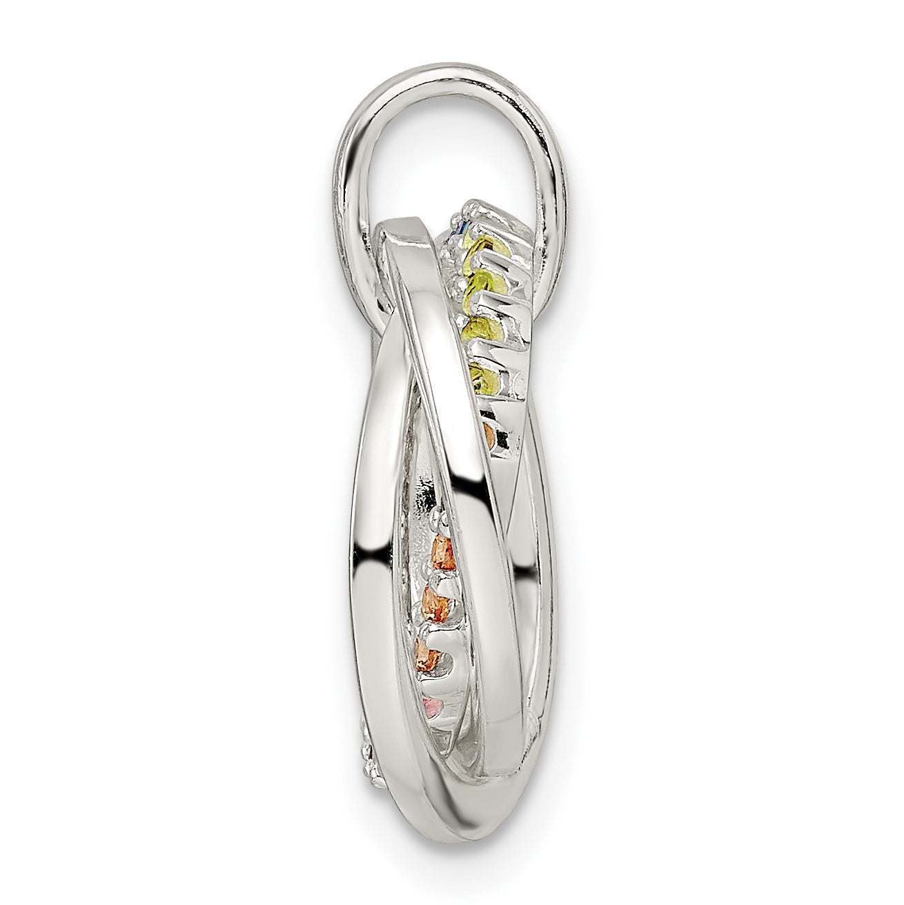 The Sterling Silver Polished Rainbow CZ Intertwined Circles Pendant adds a touch of elegance to any look. Made from pure 925 sterling silver, it boasts a polished rhodium finish that gleams with sophistication. The pendant features intertwined circles adorned with dazzling rainbow CZ stones, capturing light and attention alike. Perfectly sized at 22.5 mm in length, it's a beautiful statement piece for any occasion. The design also includes a sturdy bail, ensuring ease of wear. This women's jewelry stands out with its brilliant silver tone, making the Sterling Silver Polished Rainbow CZ Intertwined Circles Pendant a timeless treasure.