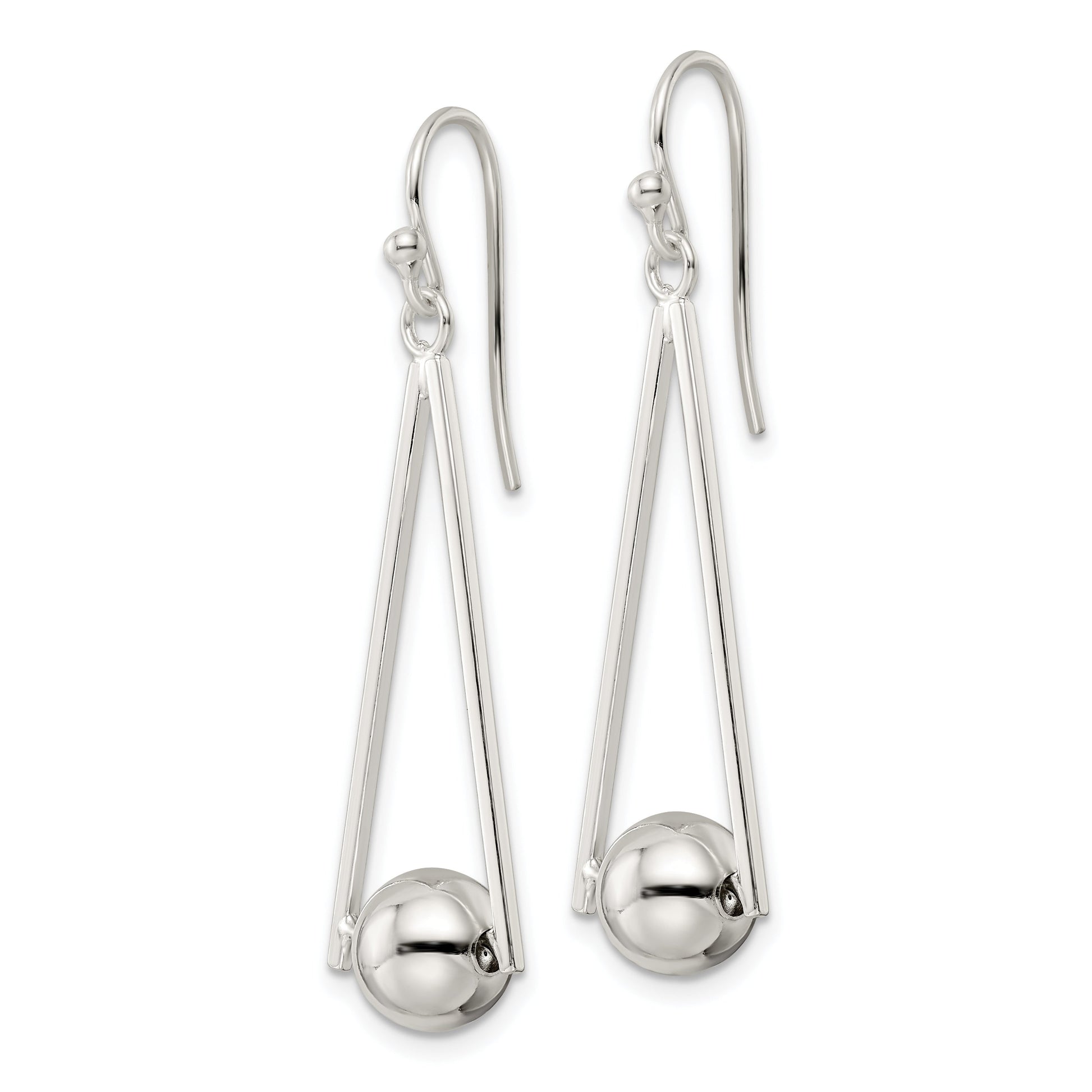 The Sterling Silver Polished Triangle & Ball Dangle Shepherd Hook Earrings offer a touch of elegance and charm to any outfit. Crafted from high-quality 925 sterling silver, these earrings feature a beaded texture and a sleek polished finish, ensuring they maintain their shine without tarnishing. At 44.6 mm in length and 12.9 mm in width, the delicate triangles and ball design create an alluring drop and dangle effect. Ideal for women who appreciate understated beauty, these earrings secure with a French wire closure for added comfort. The Sterling Silver Polished Triangle & Ball Dangle Shepherd Hook Earrings bring effortless style to any look.