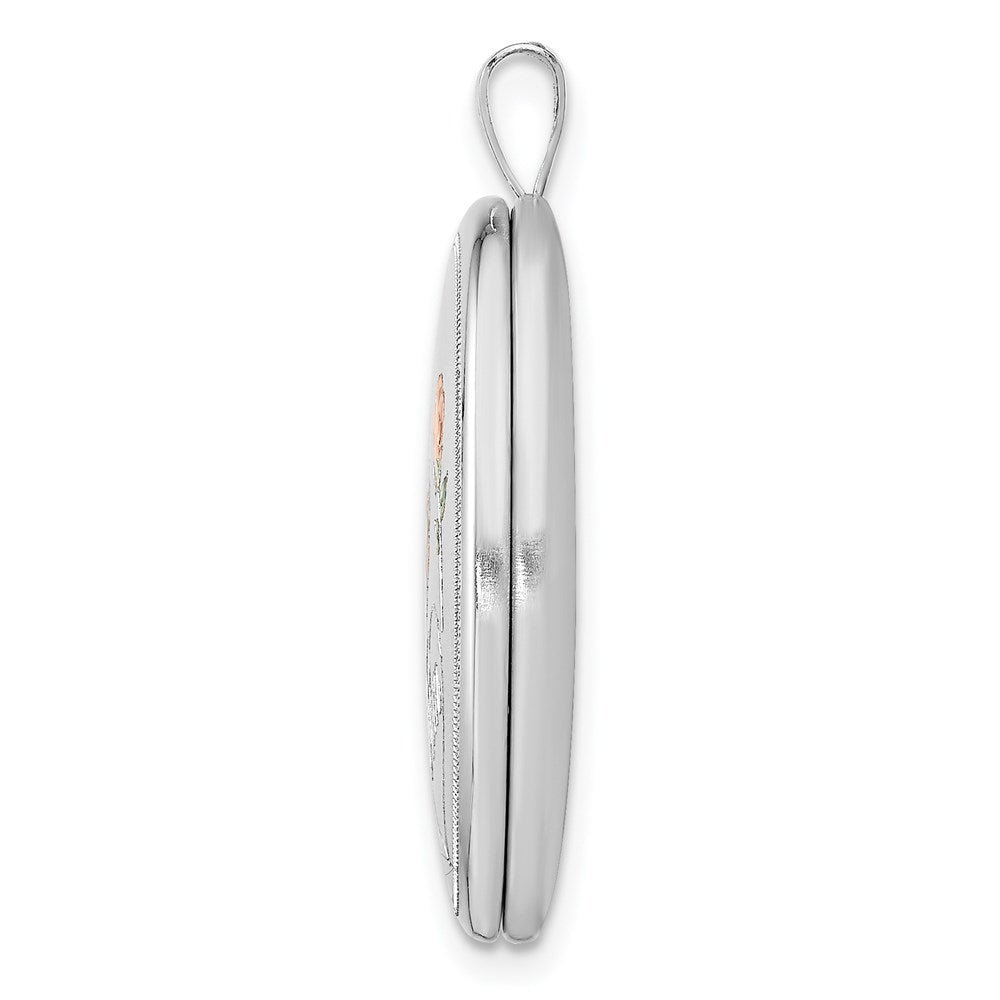 The Sterling Silver Rh 26mm Satin/Polished Enameled Roses Mom Oval Locket blends elegance with charm, creating a classic piece for your collection. Crafted from 925 sterling silver, this locket features an alluring rhodium plating for a refined look. Its stunning enameled roses, in soft pink and green accents, add a touch of nature's beauty. Measuring 31.5 mm in length and 20.5 mm in width, this women's locket is hollow yet sturdy, perfect for daily wear. It opens up to securely hold two 13.5x19.7mm oval photos. The satin back and silver tone finish give it a timeless appeal, making the Sterling Silver Rh 26mm Locket a cherished gift for moms everywhere.